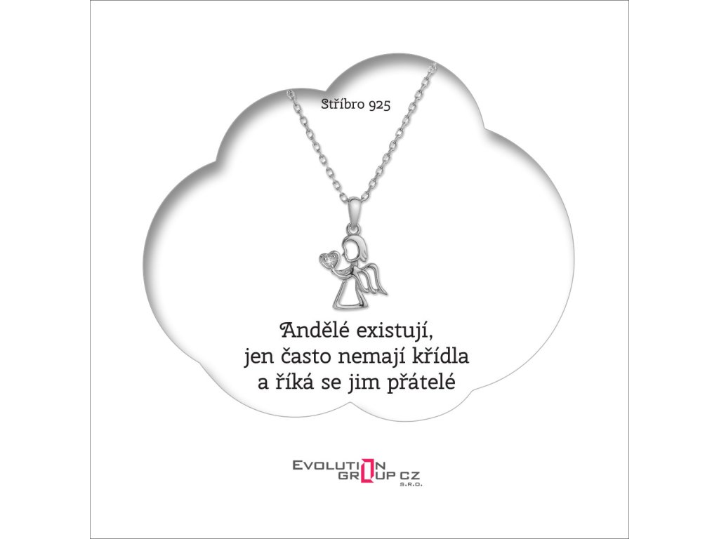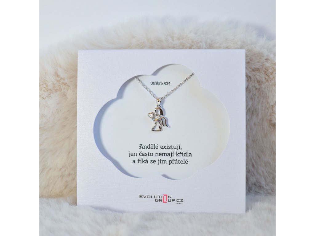 Darčekový set obsahuje strieborný náhrdelník anjel držiaci srdiečko zo zirkónu. Je zavesený na darčekovej karte s nádherným prianím „Anjeli existujú, len často nemajú krídla a hovorí sa im priatelia“. Krásny nežný darček pre kamarátku, ktorá je vašim strážnym anjelom.