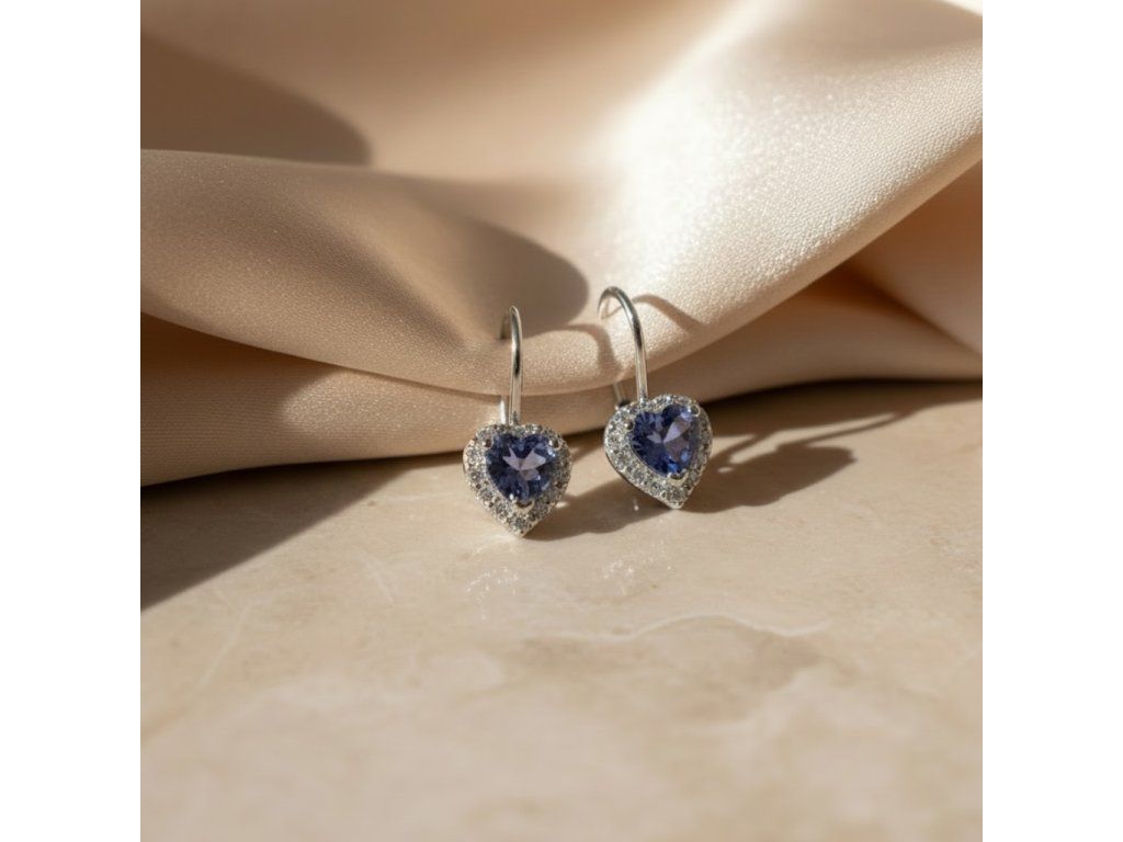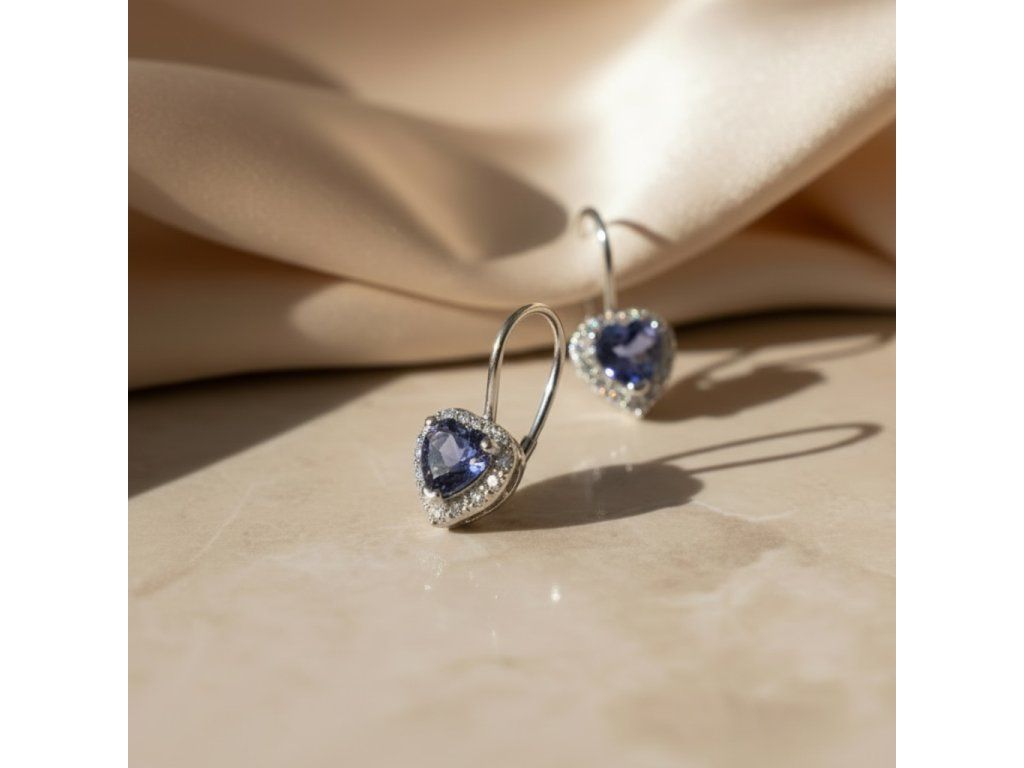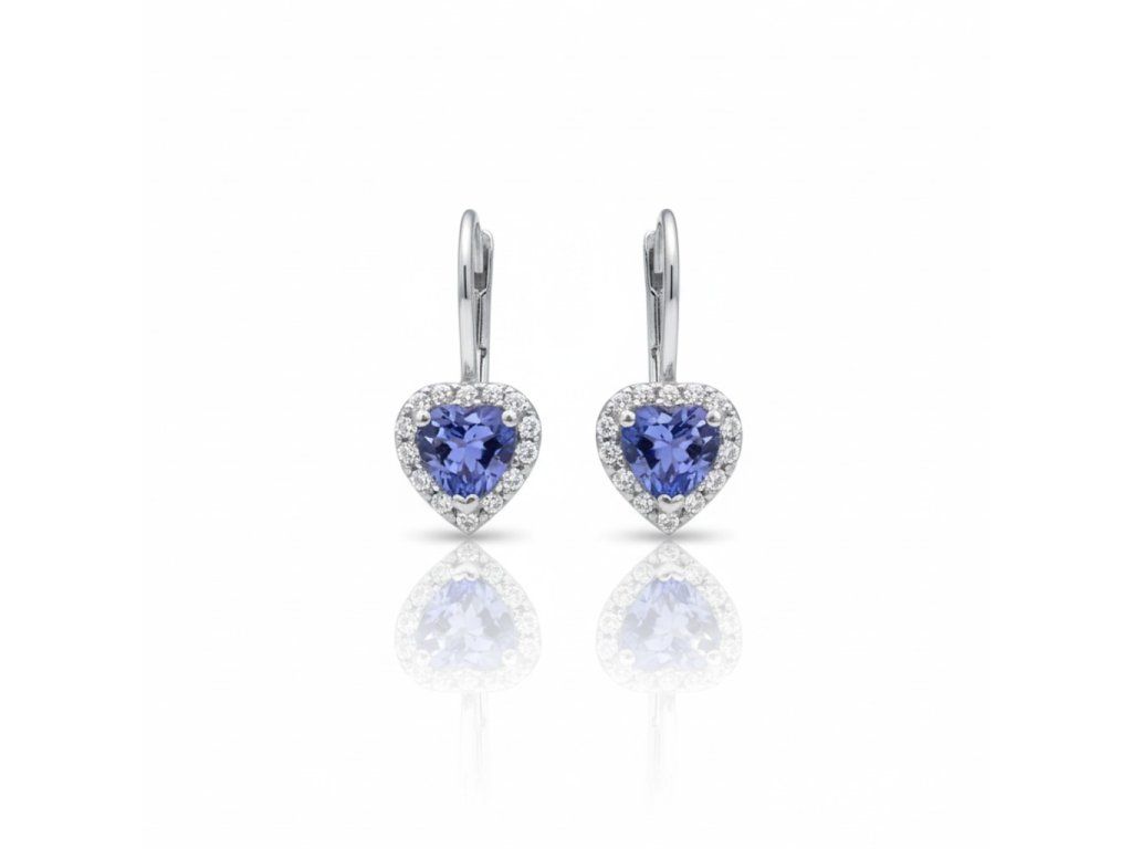 Briliantové náušnice v tvare srdca s Tanzanitom zo 14K zlata