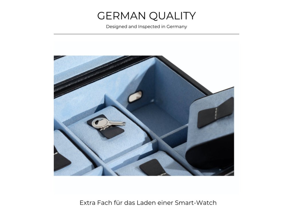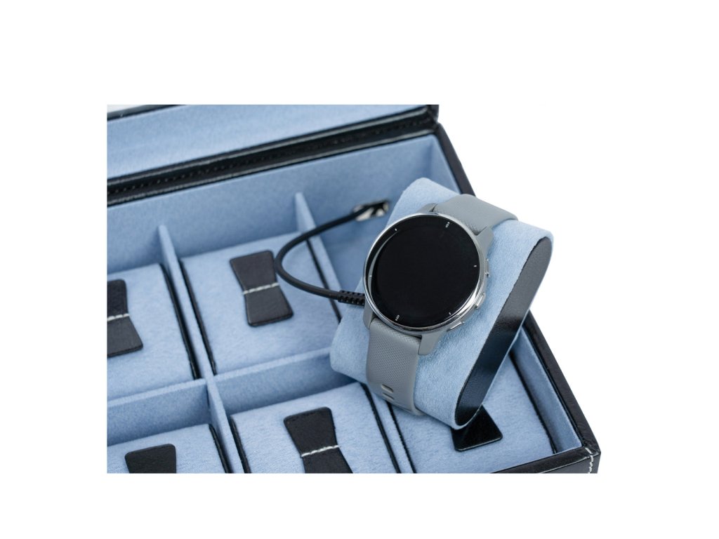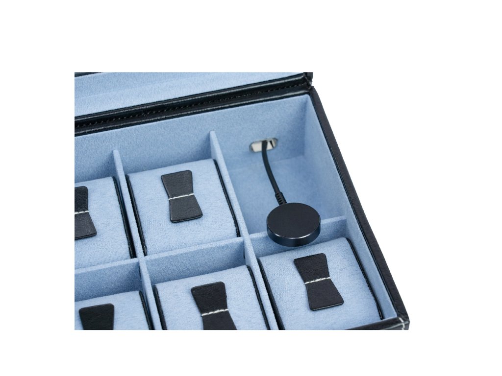 Vnútro je vystlané kvalitnou velúrovou podšívkou, ktorá chráni hodinky pred poškriabaním a opotrebovaním. Box je navyše uzamykateľný, čo zaručuje vyššiu mieru bezpečnosti pri skladovaní doma aj na cestách. Praktické nariasené vrecko vo veku poskytuje priestor na drobné doplnky.