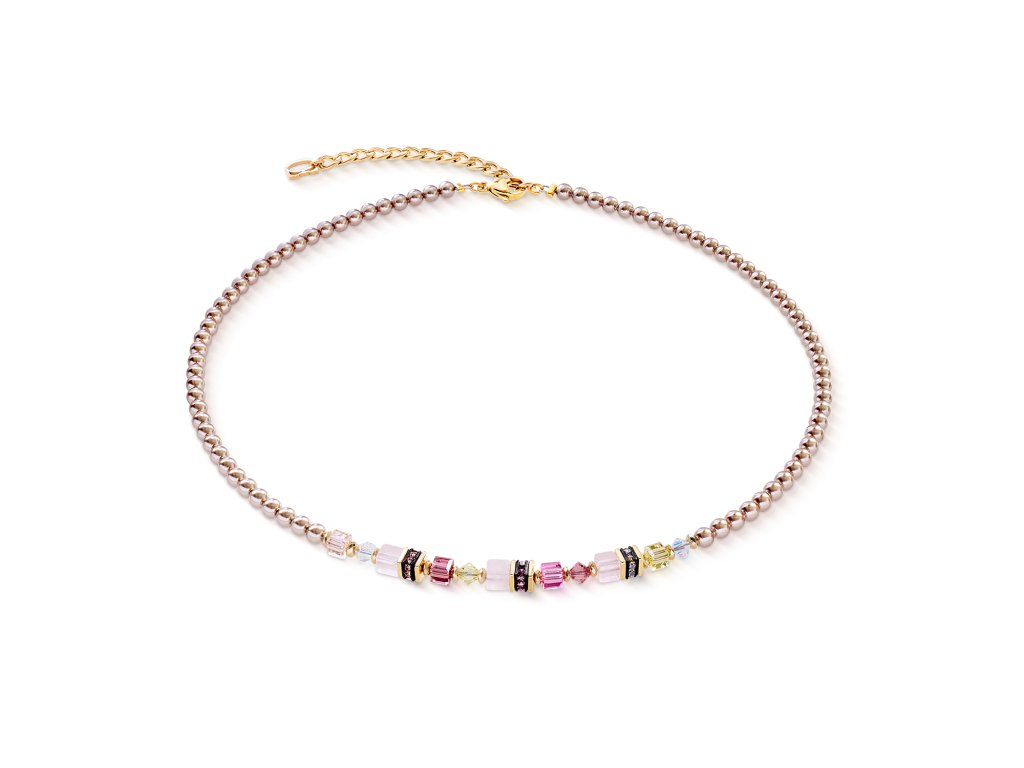 Jemné ružové nuansy sa stretávajú so žiarivými akcentmi: Zlatý náhrdelník Princess Rose Glow kombinuje krištáľové perly Swarovski® v tmavoružovej/šampanskej farbe s fazetovanými kryštálmi Swarovski®, kockami drahokamov z ruženína.