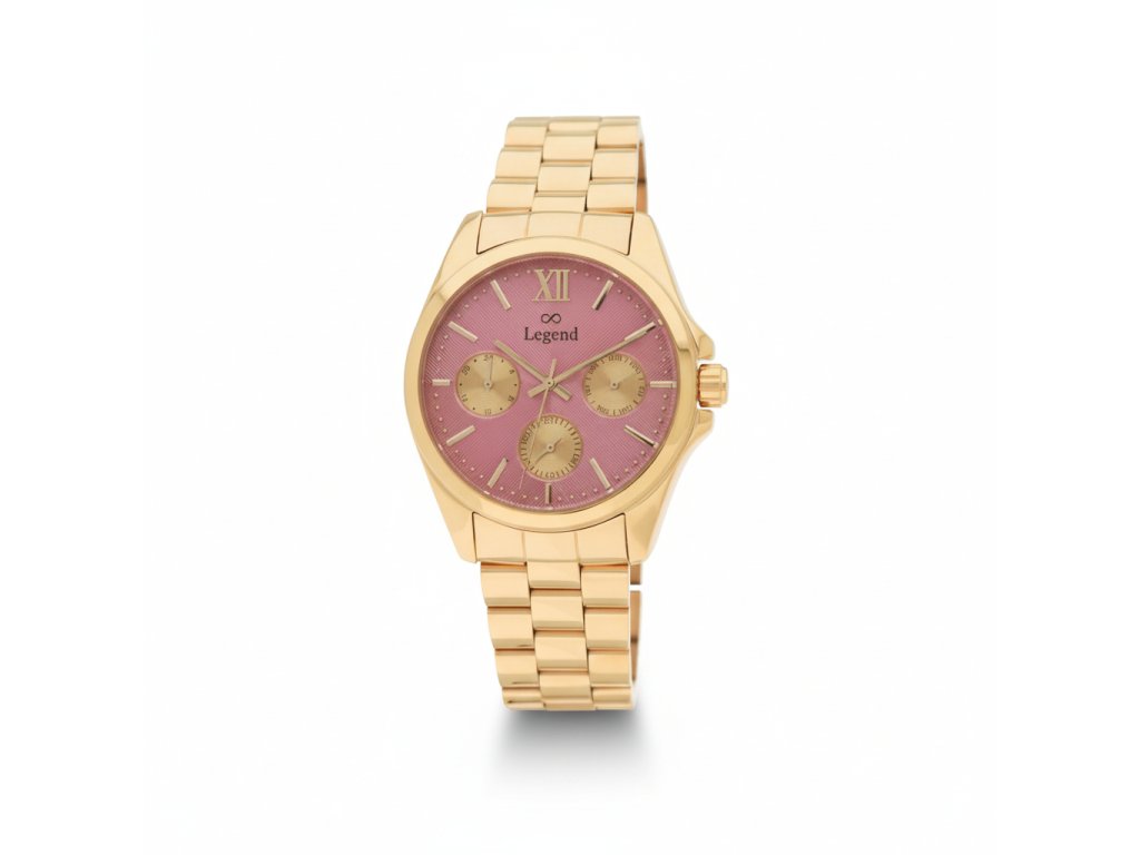 Krásne dámske chronografové hodinky LEGEND 3D961m z ružového zlata s netradičným ružovým ciferníkom, s PVD úpravou. Pri tejto úprave sa nanášaný materiál spája s podkladom na molekulárnej báze. Výsledkom sú hodinky s vysokou odolnosťou voči korózii a kyselinám. Nanesená farba sa neolupuje ani neodiera. A navyše nie sú pri PVD úprave prítomné žiadne škodlivé chemikálie, preto je konečný povrch vhodný aj pre tú najcitlivejšiu pokožku.