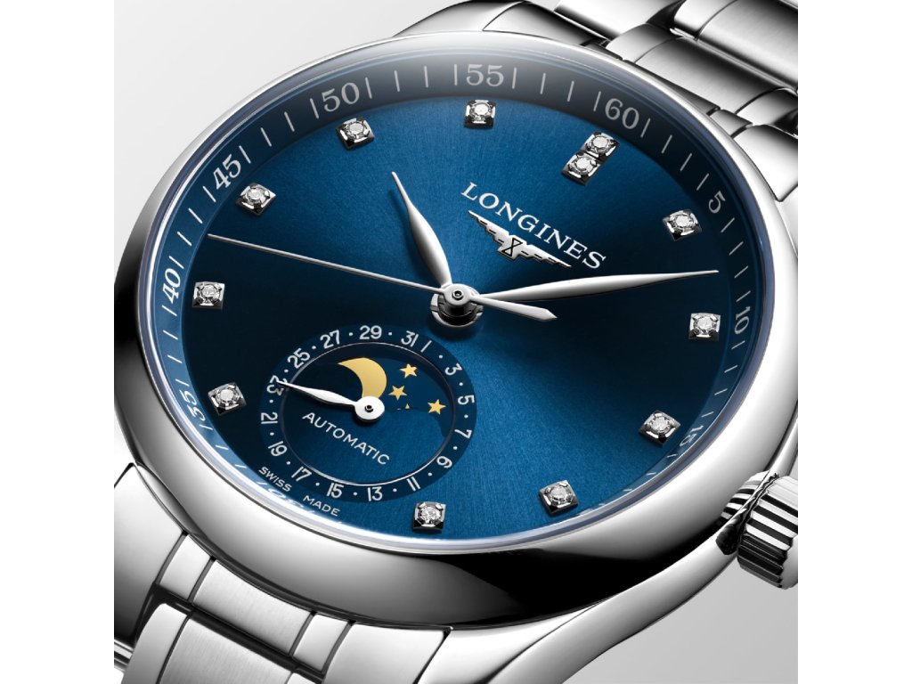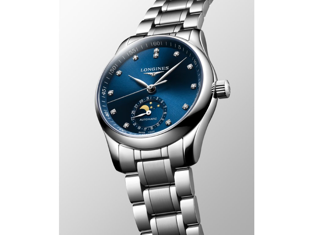 Kolekcia Master Collection Moonphase od značky LONGINES stelesňuje to najlepšie z tradičného švajčiarskeho hodinárstva. Tento elegantný model s modrým "sunray" ciferníkom, briliantmi a funkciou fázy mesiaca je dokonalým spojením klasickej estetiky a modernej mechaniky.