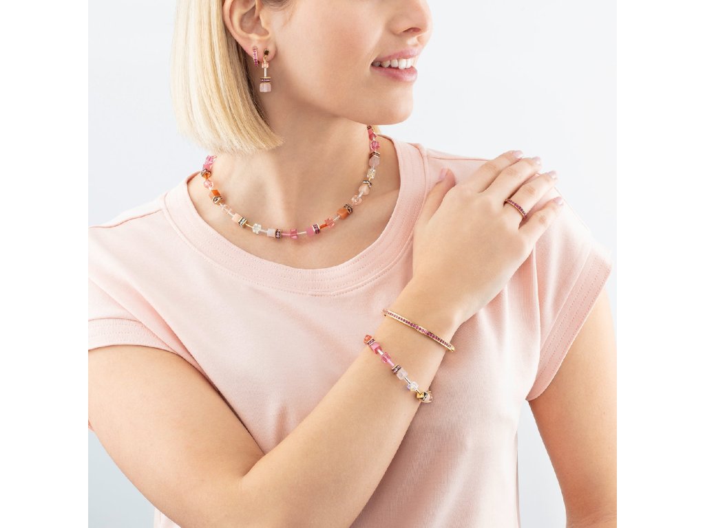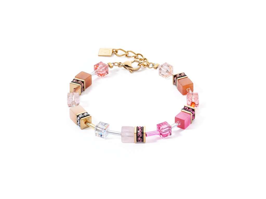Náramok GeoCUBE® Iconic Precious pink-orange očarí harmonickou kombináciou teplých farieb a prírodných kameňov. Dizajn inšpirovaný ikonickou kolekciou GeoCUBE® spája krásu ružového a červeného avanturínu, ruženínu a syntetického tigrieho oka s elegantnými zlatými akcentmi. Tento náramok je ideálnym doplnkom pre ženy, ktoré milujú ženský, sofistikovaný štýl.