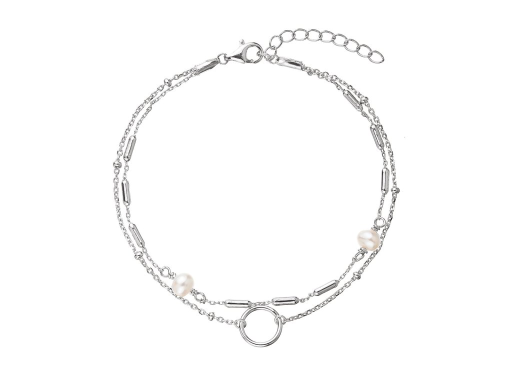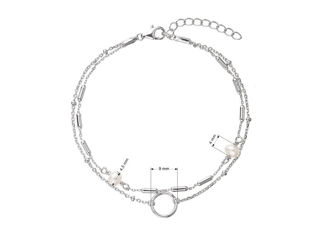 Náramok 23015.1 je vyrobený zo striebra rýdzosti 925/1000 , ktoré prešlo povrchovou úpravou ródiom. Ródium chráni šperk proti sčerneniu, zožltnutiu i poškriabaniu. Dvojradový náramok má viac druhov ozdôb, od okrúhleho minimalistického krúžku až po bielu riečnu perlu . Perly na retiazke sú oválneho tvaru s priemerom cca 4 mm a kvality A . Keďže šperk neobsahuje žiadny prídavok niklu , môžu ho bez obáv nosiť aj alergici.