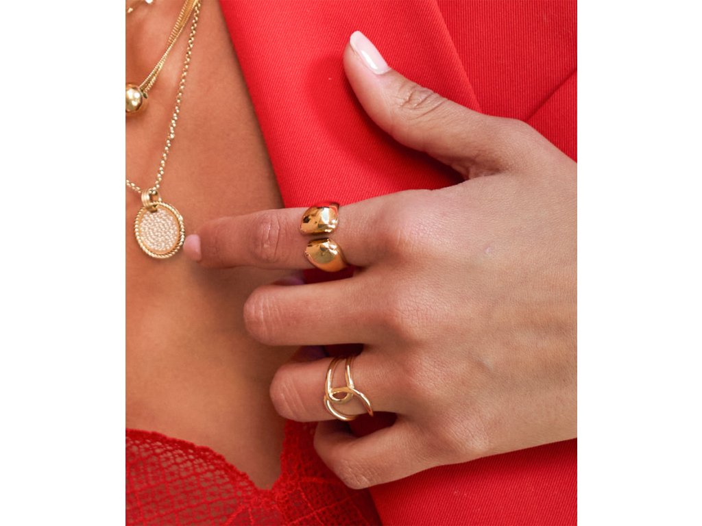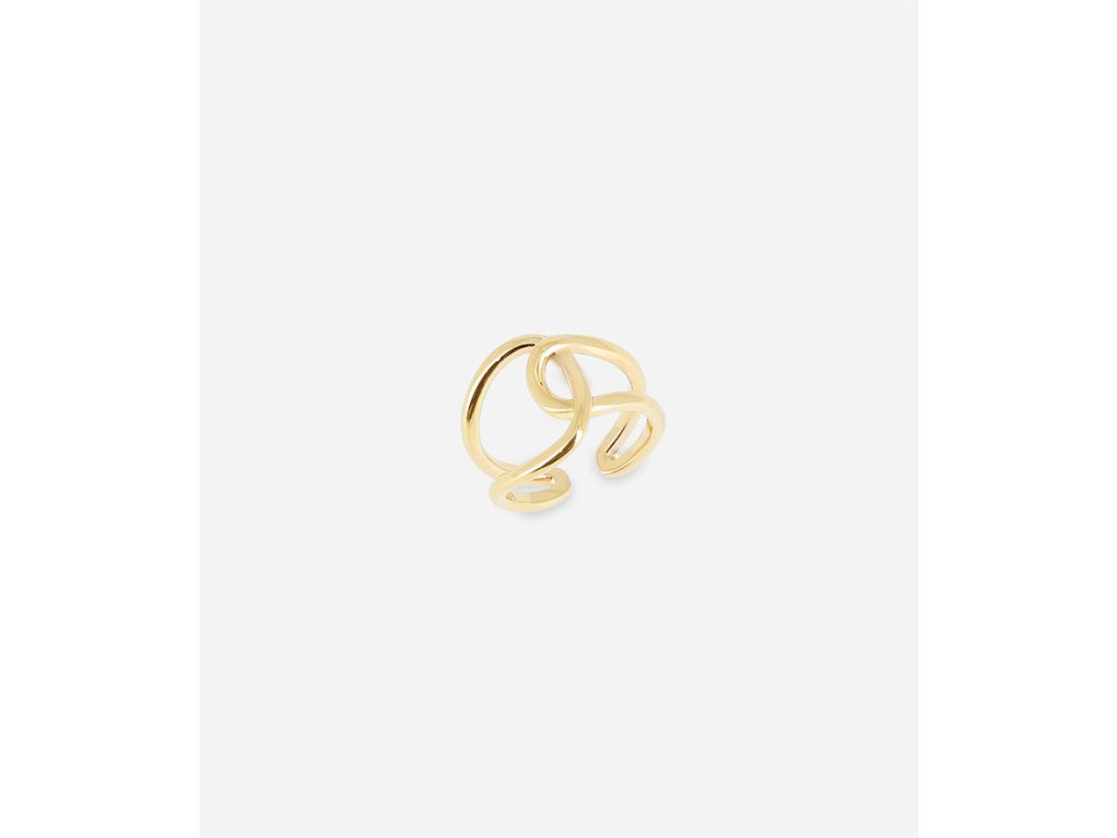 Prsteň z hladkej ocele pozlátený jemným zlatom. Tento prsteň sa vpredu prekríži vďaka dvom zaobleným tvarom, ktoré sa navzájom prelínajú.
