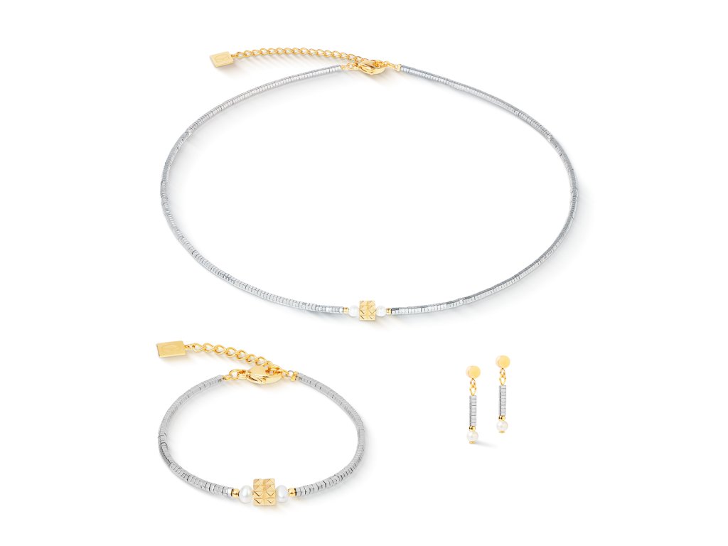 Diskrétny lesk, no silný výraz – náramok Edge & Grace kombinuje chladný strieborný tón s teplým odtieňom zlata a v strede ho ozvláštňuje výrazná kocka s hrotom. Jemné riečne perly dodávajú dizajnu štýlové zakončenie a podčiarkujú jeho jedinečný charakter. Tento šperk je ideálny pre všetkých, ktorí majú radi čistý dizajn, ale hľadajú niečo výnimočné.