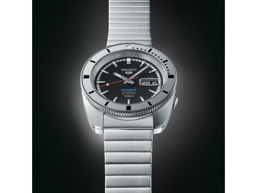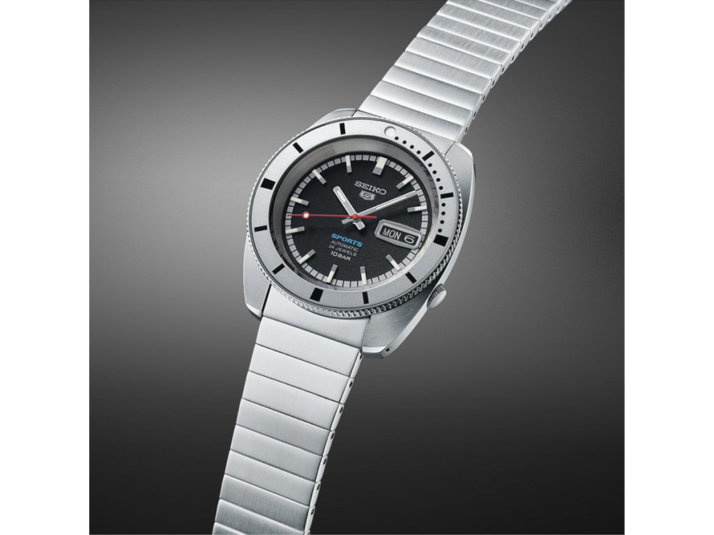 🔹 Retro dizajn s historickým logom Seiko 5 Sports – verná reedícia s červenou sekundovou ručičkou a nápisom „SPORTS“