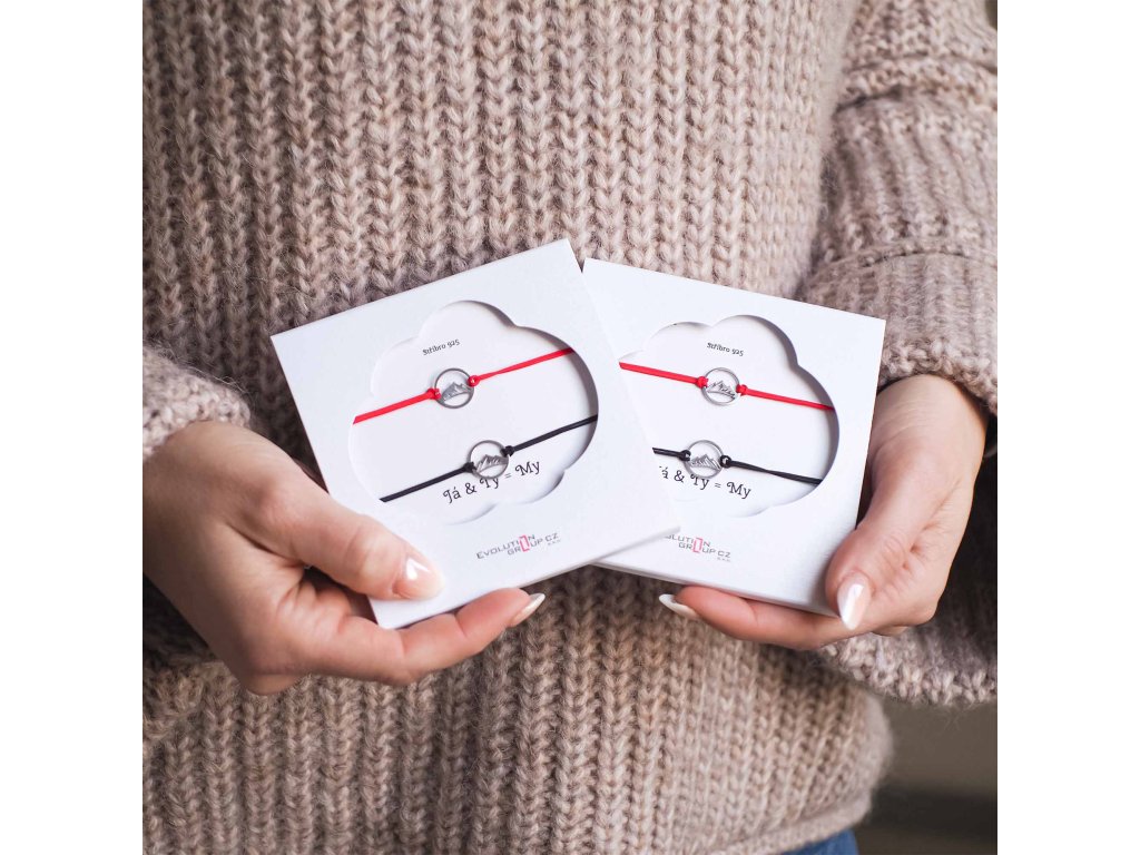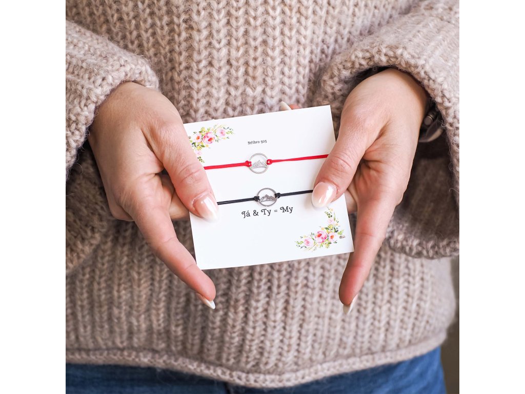 - Dva náramky: Jednoduché a štýlové náramky s nastaviteľnou šnúrkou – jeden na čiernej a druhý na červenej šnúrke.