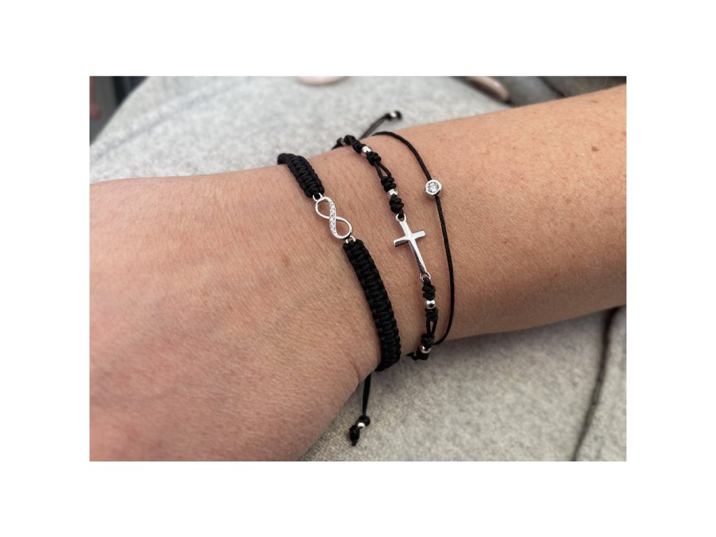 Textilný náramok je dozdobený okrúhlym komponentom s bielym zirkónom, ktorý je vyrobený z ródiovaného striebra 925/1000.