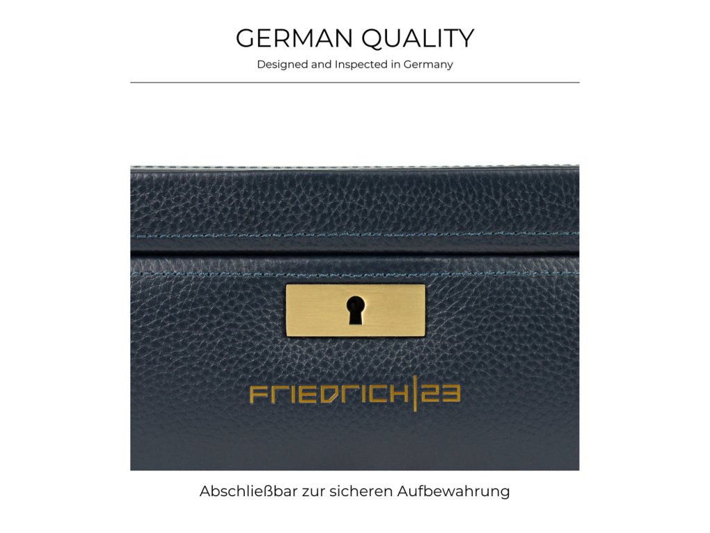 Box je vyrobený z pravej full-grain kože, kovanie a zámok sú z kartáčovanej mosadznej zliatiny, čo podčiarkuje jeho luxusný charakter.