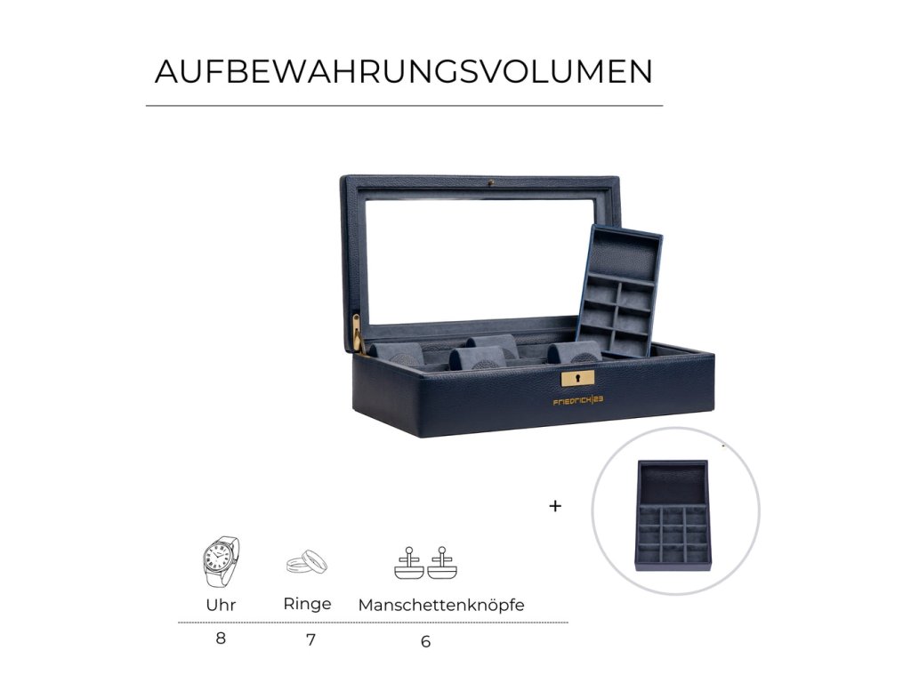 Dominantou kolekcie je špeciálna priehradka na smart hodinky s praktickým otvorom na nabíjací kábel. Nechýba ani vyberateľná šperkovnica, ktorá umožňuje bezpečné a štýlové uloženie prsteňov, manžetových gombíkov a ďalších doplnkov. Sklenené veko poskytuje elegantný pohľad na vašu zbierku, zatiaľ čo systém Soft Close zabezpečuje tiché a jemné zatváranie.