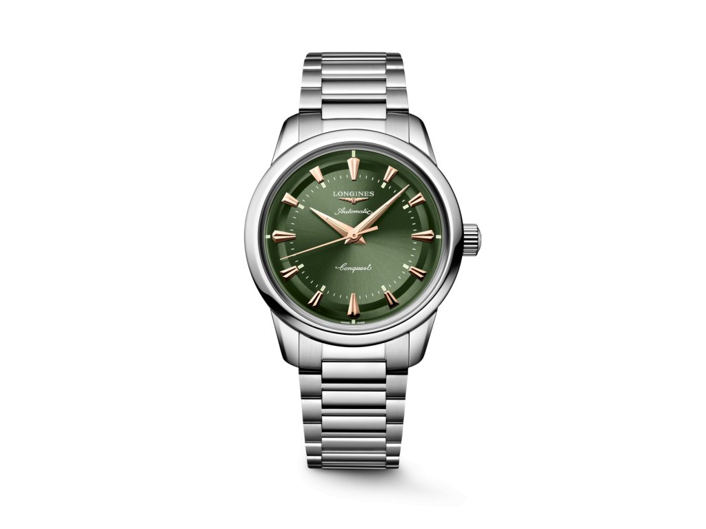 Longines Conquest Heritage v sebe spája klasickú eleganciu 50. rokov s modernými hodinárskymi technológiami. Longines Conquest Heritage zaujme svojím lešteným zeleným lakovaným ciferníkom, automatickým strojčekom so 72-hodinovou rezervou chodu a jemnými retro detailmi, ako je zlatý medailón s motívom ryby na zadnej strane.