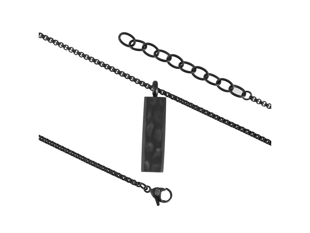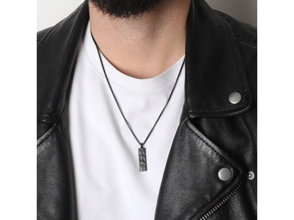 Elegantný pánsky náhrdelník z matnej čiernej ocele, ktorý vyniká svojim moderným a minimalistickým dizajnom. Dominantou je obdĺžnikový oceľový prívesok, ozdobne tvarovaný do precíznych detailov, ktoré dodávajú šperku jedinečný charakter. Pevný a odolný materiál zaisťuje dlhú životnosť, zatiaľ čo čierne matné prevedenie podčiarkuje jeho sofistikovaný a mužný vzhľad. Ideálny doplnok pre mužov, ktorí preferujú štýlové a kvalitné šperky. Nastaviteľná dĺžka 50+5 cm umožňuje prispôsobenie pre perfektné padnutie.