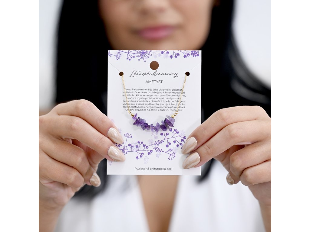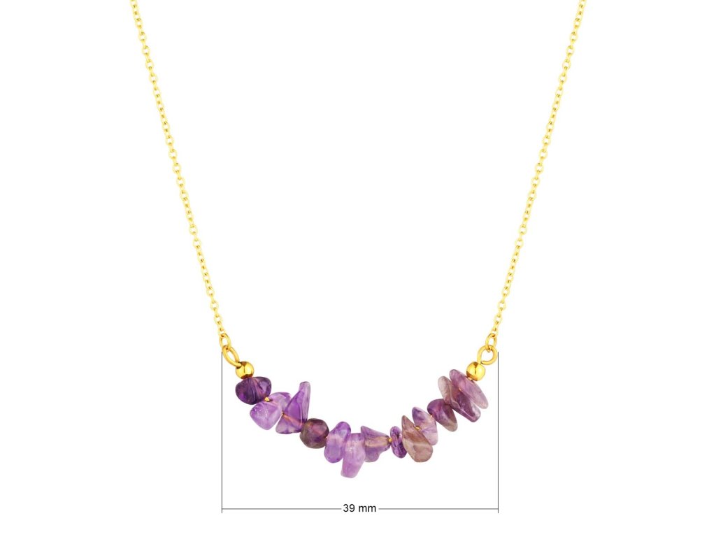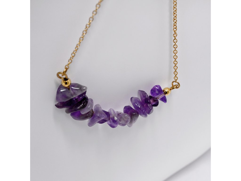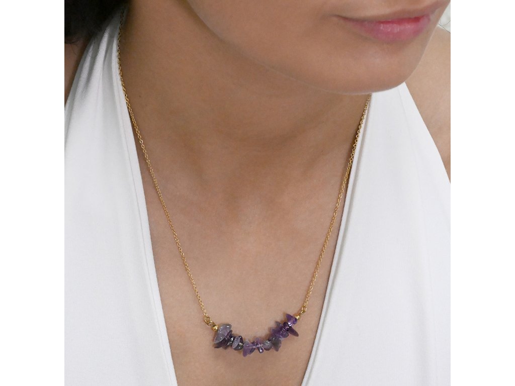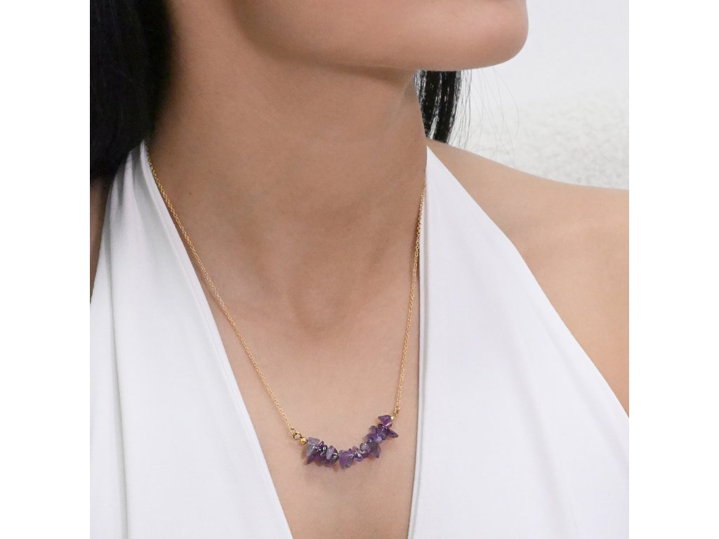 Náhrdelník s ametystom je skvelou voľbou pre tých, ktorí hľadajú eleganciu a štýl. Fialové kamene majú nepravidelný tvar, čo dodáva šperku jedinečný vzhľad. Každý kameň je starostlivo vybraný a usporiadaný podľa veľkosti, čo zaisťuje harmonický vzhľad. Tento náhrdelník je ideálny na každodenné nosenie aj špeciálne príležitosti.