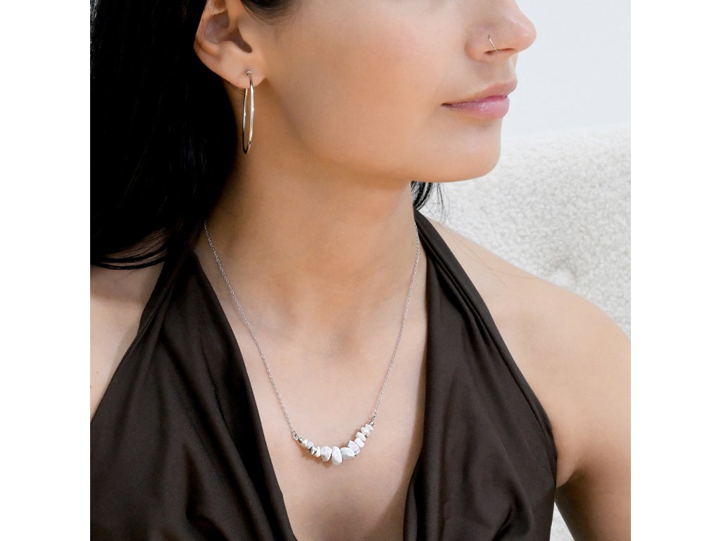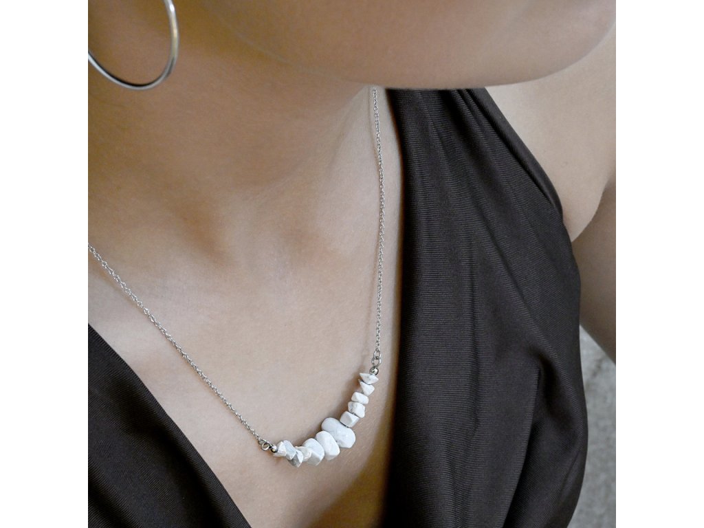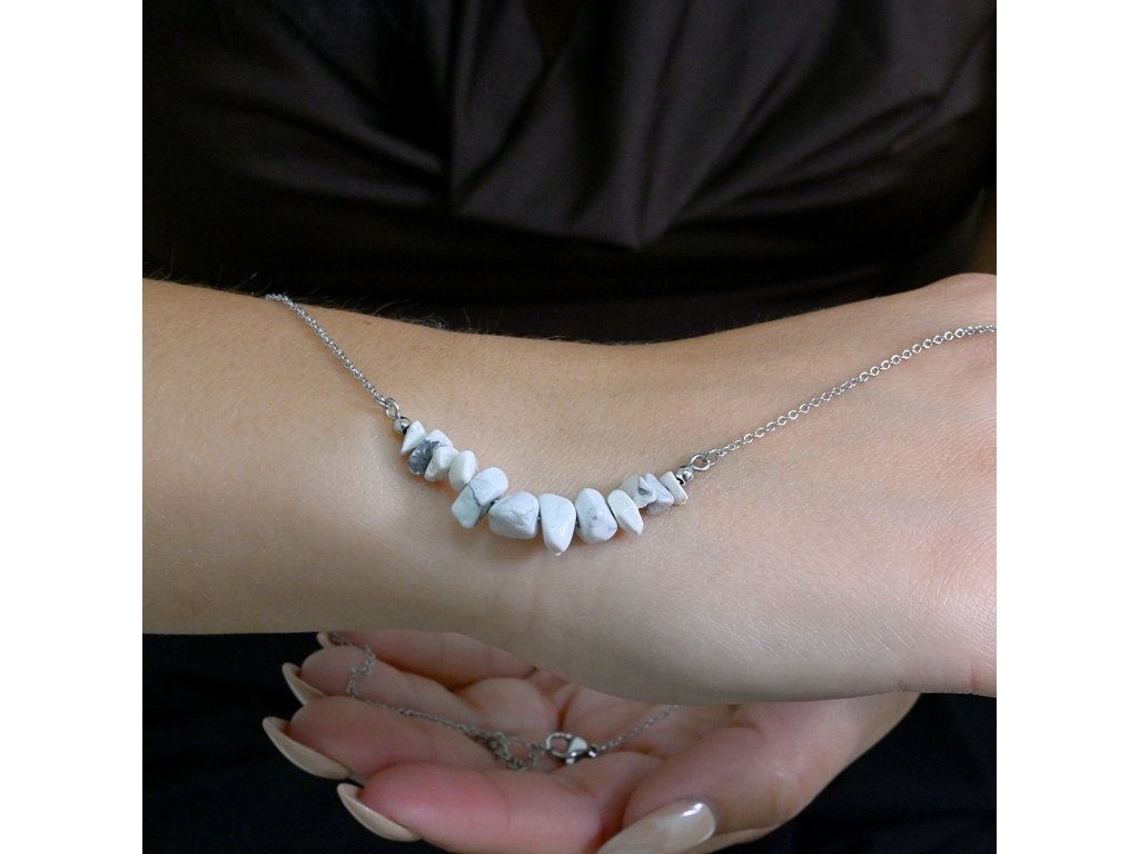 Náhrdelník s bielym howlitom zaujme svojim elegantným dizajnom . Nepravidelné tvary kameňov dodávajú šperku jedinečný vzhľad, ktorý sa hodí k akémukoľvek outfitu. Howlit je známy svojim typickým tmavým žilkovaním , ktoré pridáva na jeho atraktivite. Tento náhrdelník je ideálnou voľbou pre tých, ktorí hľadajú niečo výnimočné.