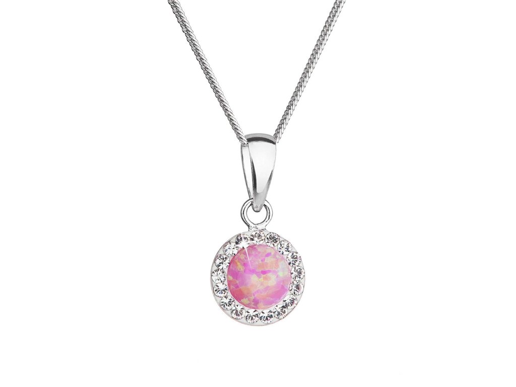 Náhrdelník obsahuje retiazku s okrúhlym príveskom. Šperk je vyrobený zo striebra rýdzosti 925/1000, ktoré prešlo povrchovou úpravou ródiom. Ródium chráni šperk proti sčerneniu, zožltnutiu aj poškriabaniu. Prívesok je zdobený ružovým syntetickým opálom, ktorý je navyše olemovaný malými trblietavými Preciosa krištáľmi v bielej farbe. Môžete si k nemu vybrať aj rovnaké náušnice so zapínaním na puzetu alebo skrutku. Keďže šperk neobsahuje žiadny prídavok niklu, môžu ho bez obáv nosiť aj alergici.