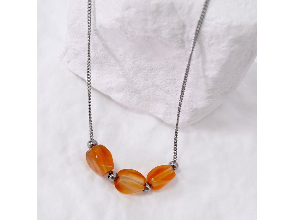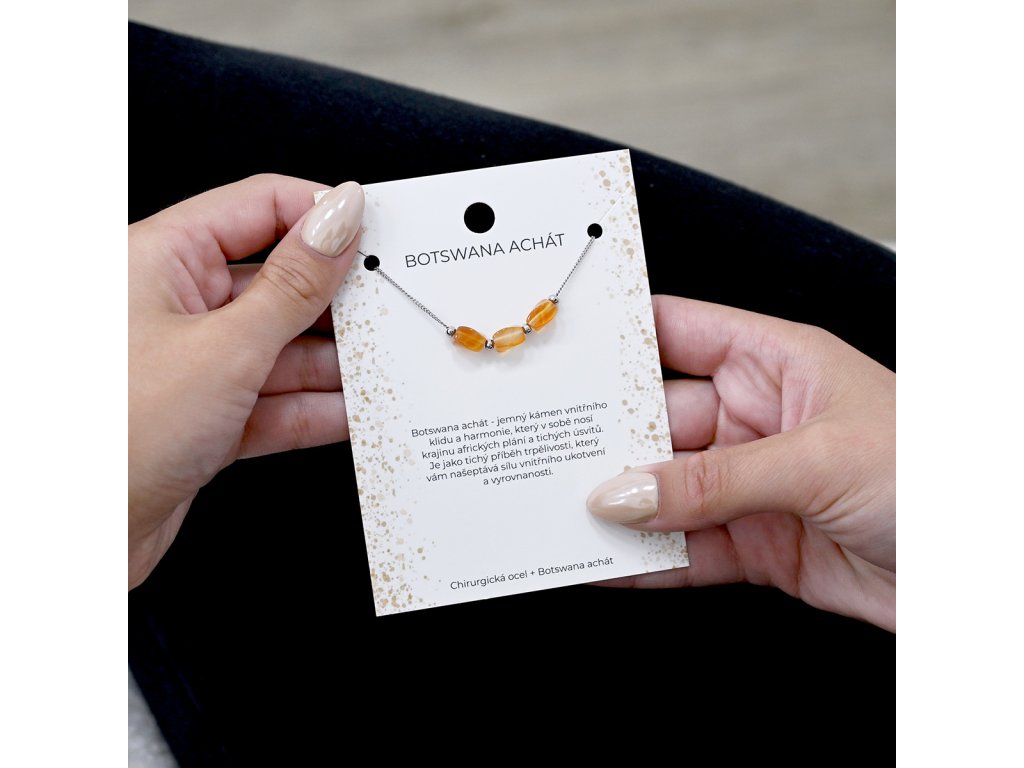 Náhrdelník z achátu Botswana ponúka unikátny vzhľad , ktorý zaujme na prvý pohľad. Jemná oranžová farba kamienkov prináša do každého outfitu nádych elegancie. Achát Botswana je známy svojou schopnosťou prinášať vnútorný pokoj a harmóniu. Jeho prírodná krása je inšpirovaná africkými pláňami a tichými úsvitmi.