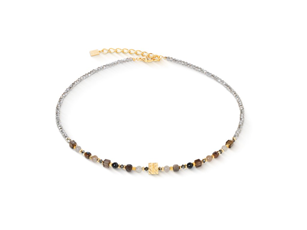 Elegantná prírodná krása v modernom prevedení – presne to prináša náhrdelník Shape Mix Spikes Smoky Glow. V jeho strede sa nachádza dizajnová kocka so spike prvkom z pozlátenej ušľachtilej ocele, lemovaná trblietavými krištáľmi Swarovski® a starostlivo vybranými drahými kameňmi, ako sú dymový kremeň, čokoládový mesačný kameň, pruhovaný ónyx, achát a tigrie oko.