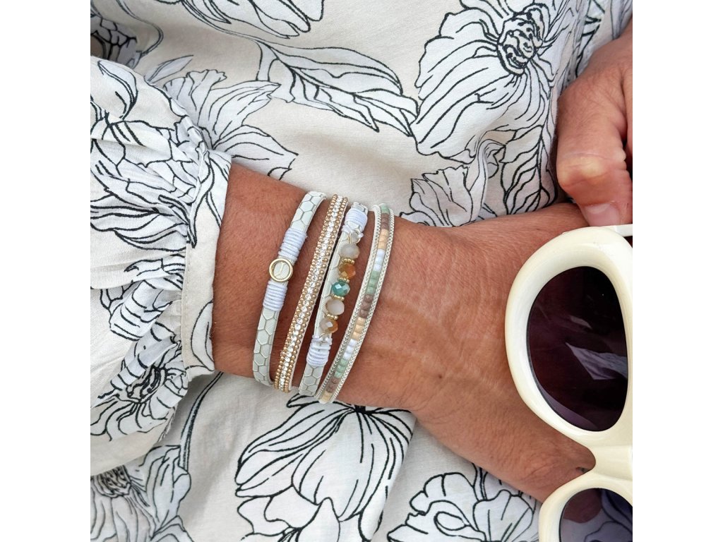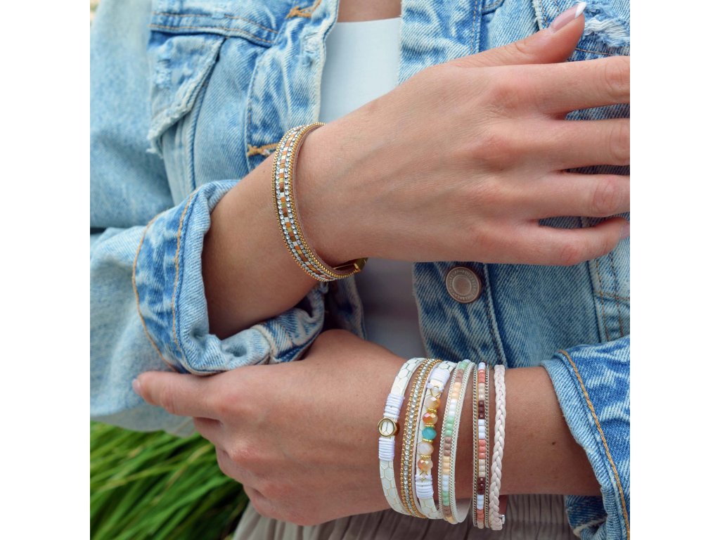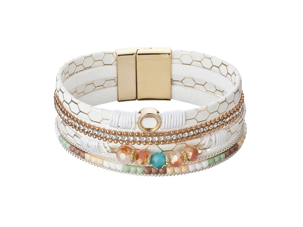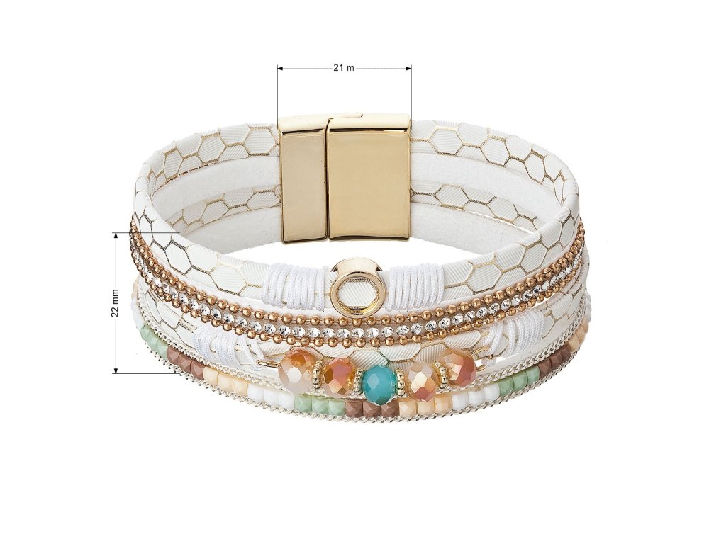 Elegantný široký náramok , ktorý pôsobivo kombinuje viac prvkov do jedného harmonického celku. Skladá sa z niekoľkých semišových pásikov rôznych textúr a štýlov, ktoré sú spojené do jedného magnetického zapínania v zlatej farbe . Tento prepracovaný doplnok spája jemnosť textilu s jemným leskom bižutérnych detailov.