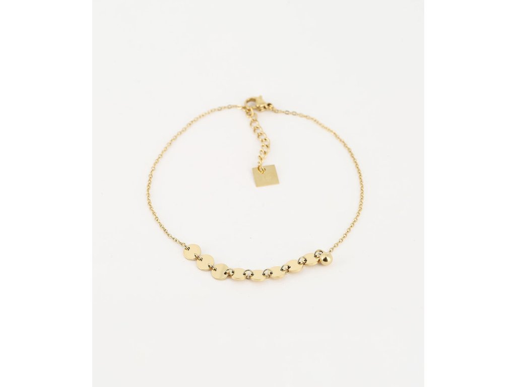 Náramok na nohu z ocele pozlátený jemným zlatom s malými kovovými príveskami.