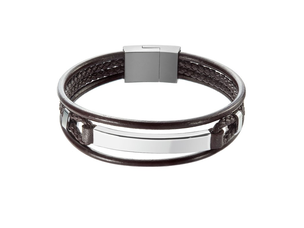 Pánsky náramok je vyrobený z rôzne tvarovaných pásikov z tmavo hnedej recyklovanej kože a koženky ozdobený oceľovým prvkom, ktorá upúta pozornosť okolia.