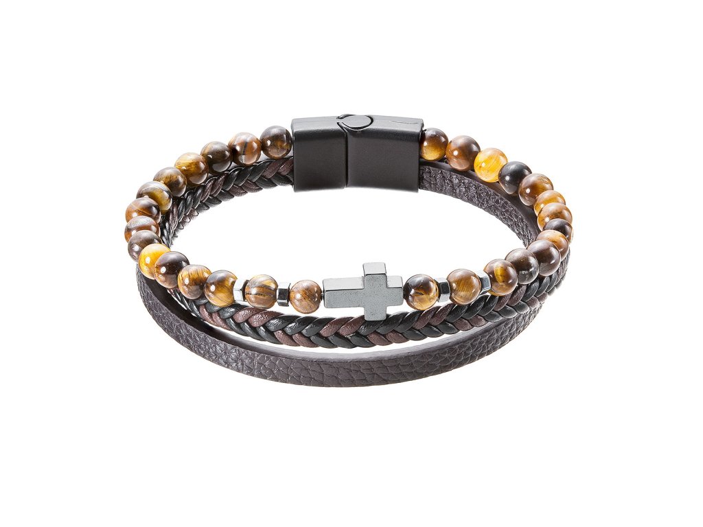 Náramok pánsky koženka a korálky tigrie oko s krížikom 43044.3 hnedý