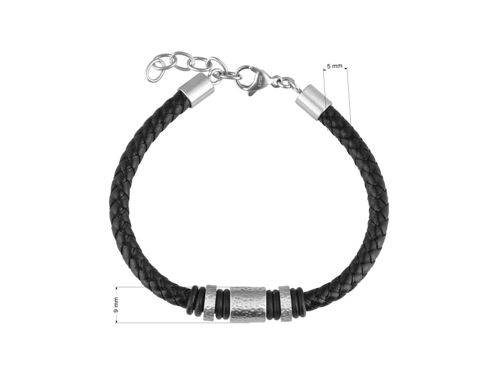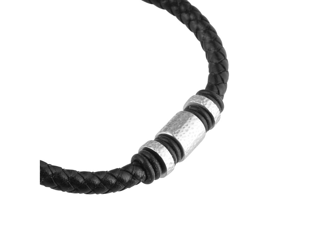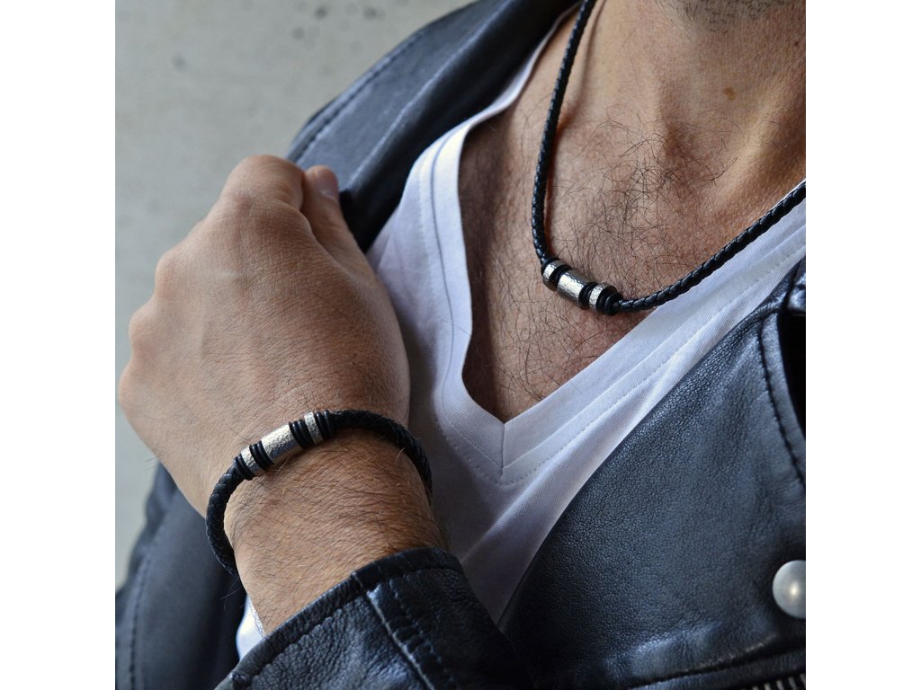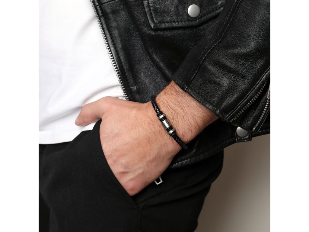 Elegantný pánsky náramok vyrobený z čiernej recyklovanej kože, starostlivo zapletené do štýlového dizajnu. Náramok je doplnený ozdobnými kovovými prvkami, ktoré dodávajú moderný a sofistikovaný vzhľad. Vďaka nastaviteľnej dĺžke 20+3 cm perfektne sedí na zápästí a zaisťuje pohodlné nosenie. Ideálny doplnok pre mužov, ktorí ocenia štýl, udržateľnosť a precízne spracovanie.