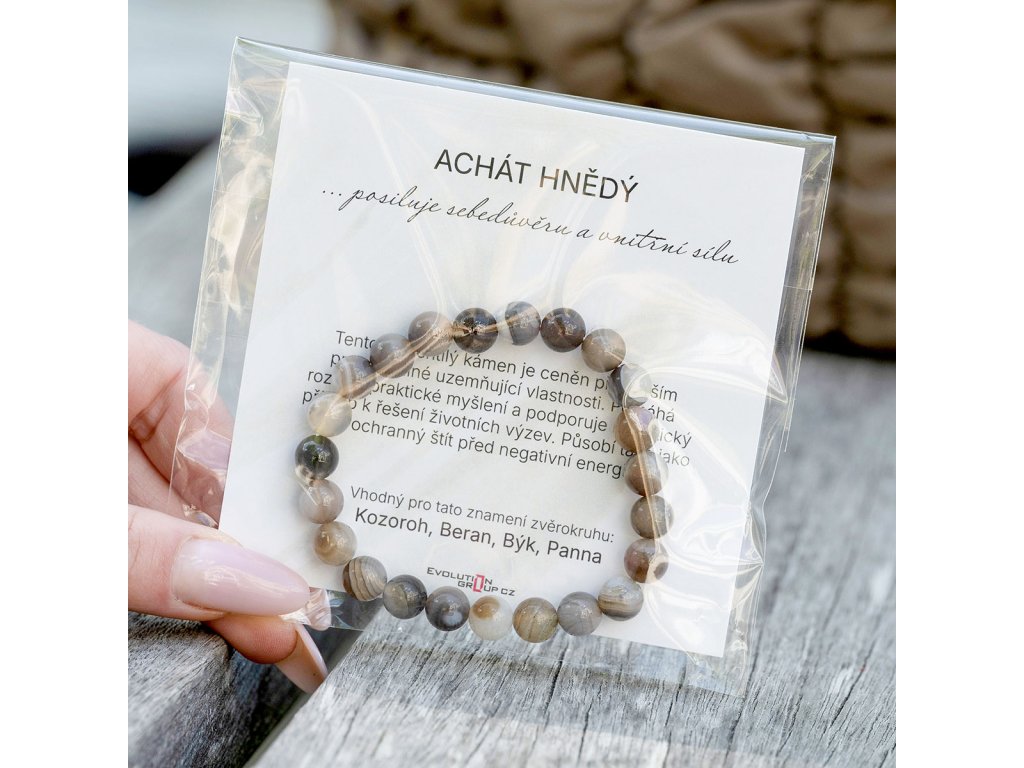 Náramok je navlečený na kartičke s popisom vlastností hnedého achátu a uložený v ochrannom sáčku.