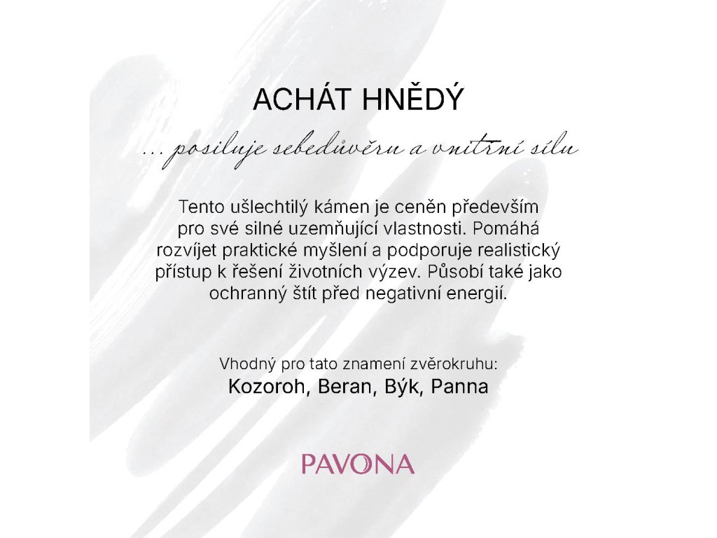 Tento štýlový náramok je vyrobený z pravých minerálnych kameňov hnedého achátu, ktorý sa vyznačuje svojou teplou, zemitou farbou a jemnými prírodnými vzormi. Namiesto klasických korálikov je zložený z oválnych kameňov s jemne brúsenými plochami, ktoré dodávajú náramku harmonický a vyvážený vzhľad, zatiaľ čo elastické prevedenie zaisťuje ľahké nasadenie a pohodlné nosenie na každom zápästí. Hnedý achát je symbolom stability, sily a ochrany, často spájaný s upokojením mysle a podporou vnútorného pokoja. Tento ušľachtilý kameň je cenený predovšetkým pre svoje silné uzemňujúce vlastnosti. Pomáha rozvíjať praktické myslenie a podporuje realistický prístup k riešeniu životných výziev. Pôsobí aj ako ochranný štít pred negatívnou energiou.
