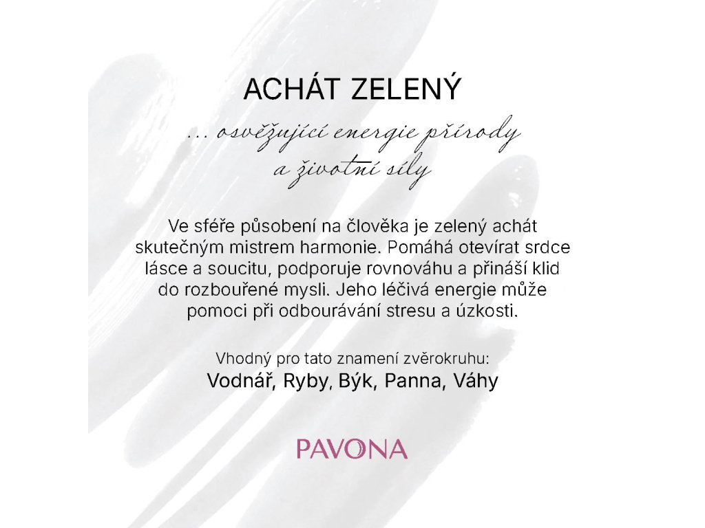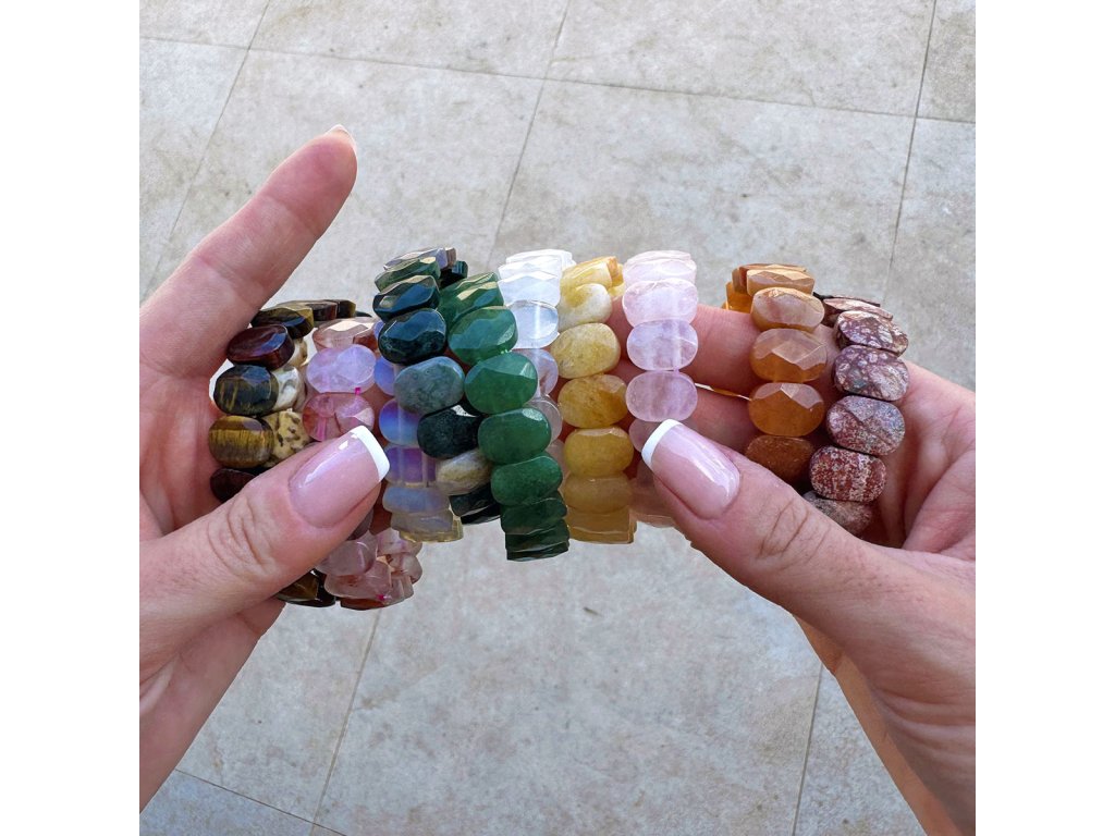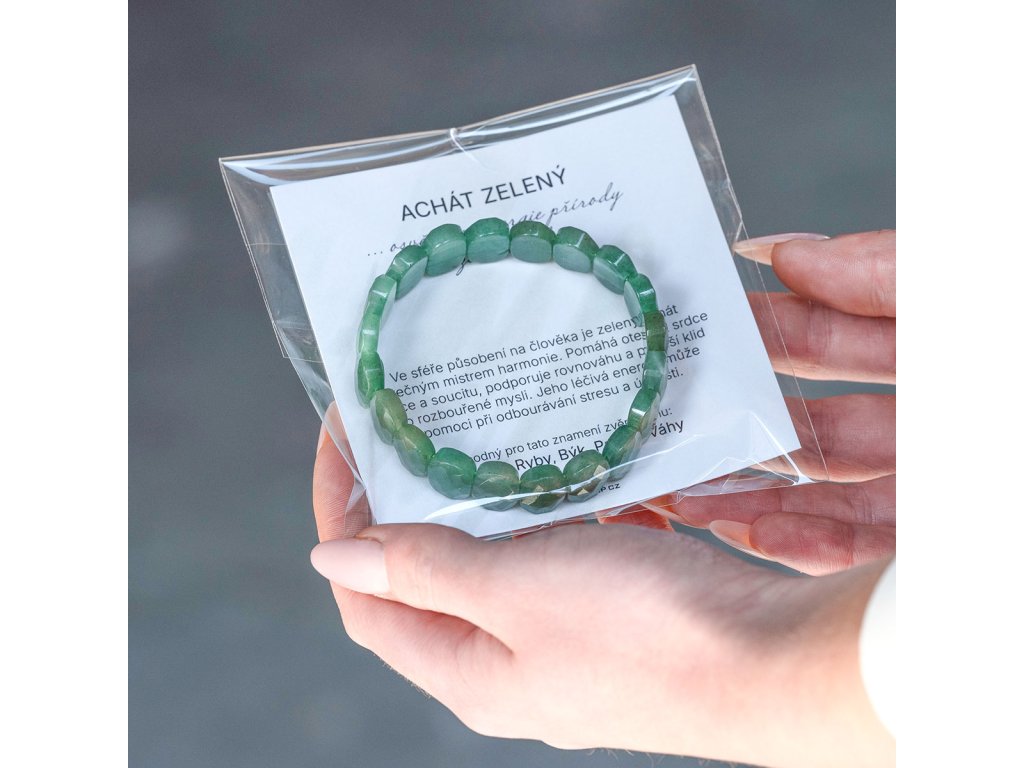 Náramok z pravého zeleného achátu v sebe snúbi prírodnú krásu a elegantnú jednoduchosť. Namiesto klasických korálikov je zložený z oválnych kameňov s jemne brúsenými plochami, ktoré sa vyznačujú sviežimi odtieňmi zelenej, ktoré evokujú harmóniu prírody a pokoj lesa. Zelený achát je skutočným majstrom harmónie. Pomáha otvárať srdce láske a súcitu, podporuje rovnováhu a prináša pokoj do rozbúrenej mysle. Jeho liečivá energia môže pomôcť pri odbúravaní stresu a úzkosti. Elastické prevedenie umožňuje pohodlné nosenie a prispôsobí sa takmer každému zápästiu.