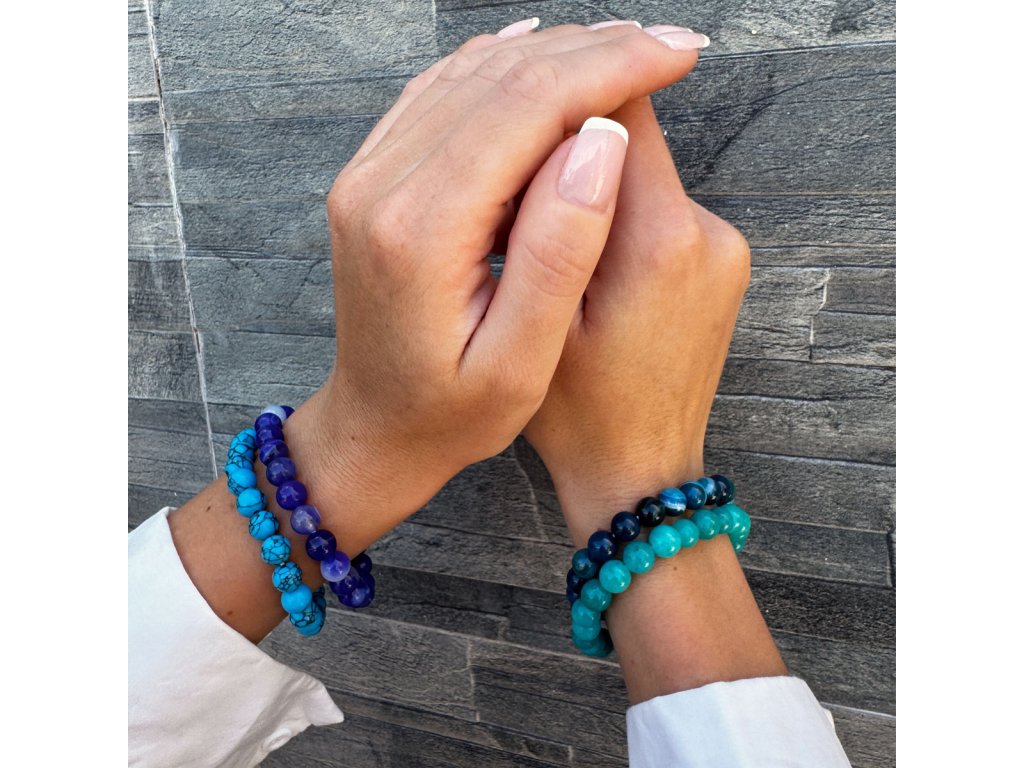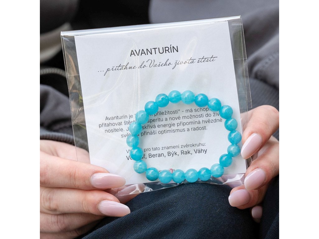 Elegantný náramok z pravého avanturínu zaujme svojim výrazným, tyrkysovo sfarbeným odtieňom – tyrkysové tóny sa harmonicky prelínajú s občasnými tmavo zelenými akcentmi. Hladké korálky s priemerom 8 mm majú prirodzený lesk a pôsobia sviežo a originálne. Každý náramok je jedinečný originál.