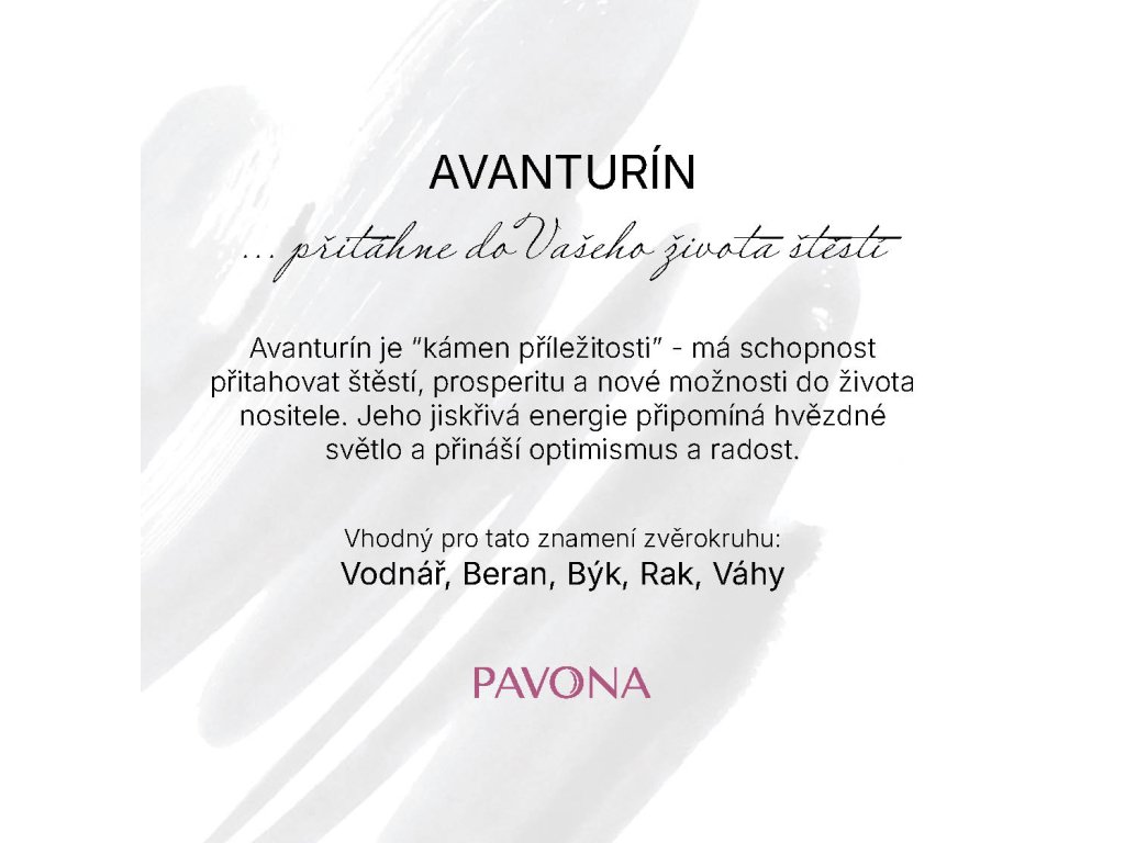 Avanturín je cenený ako kameň šťastia , pokoja a nových začiatkov. Podporuje pozitívne myslenie, dodáva odvahu pri dôležitých rozhodnutiach a pomáha uvoľniť napätie aj stres. Jeho upokojujúca energia prináša vnútornú rovnováhu, podporuje dôveru v životné procesy a otvára cestu k radosti a hojnosti.