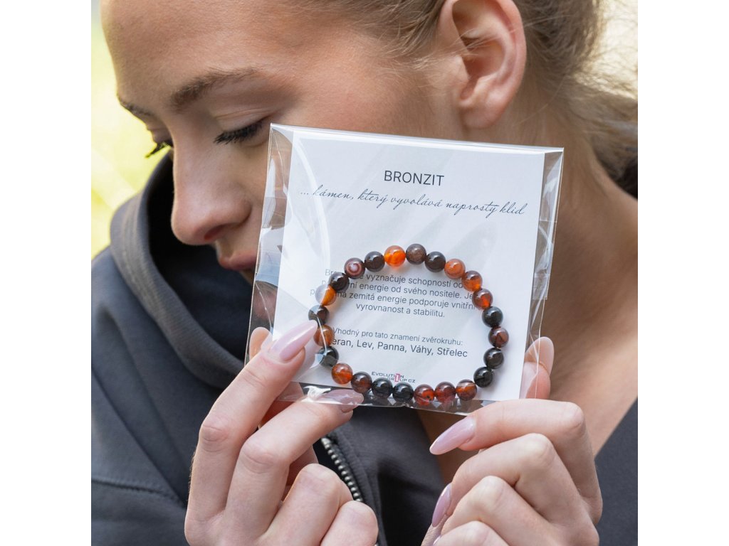 Elegantný náramok z pravého bronzitu očarí svojimi teplými, zemskými tónmi – od zlatistej bronzovej cez hnedú až po temne čokoládové odtiene. Hladké korálky s priemerom 8 mm vytvárajú harmonický celok, ktorý pôsobí pevne, pokojne a zároveň výnimočne luxusne. Každá korálka má svoju jedinečnú kresbu a štruktúru, čo dodáva náramku osobitý charakter.