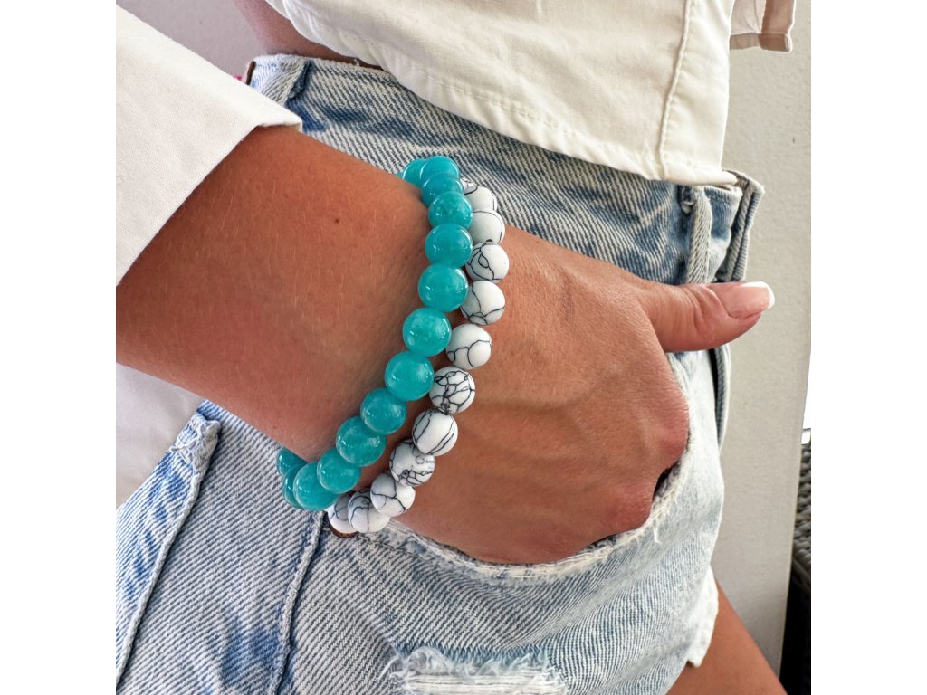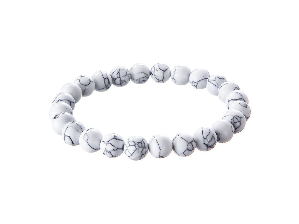 Elegantný náramok z pravého howlitu zaujme svojou jemnou eleganciou – biele až smotanové koráliky s typickou šedou žilnatinou vytvárajú harmonický celok, ktorý pôsobí čisto, pokojne a štýlovo zároveň. Hladké korálky s priemerom 8 mm majú matný povrch a prírodný vzhľad, vďaka čomu sa náramok hodí k akémukoľvek outfitu aj príležitosti.