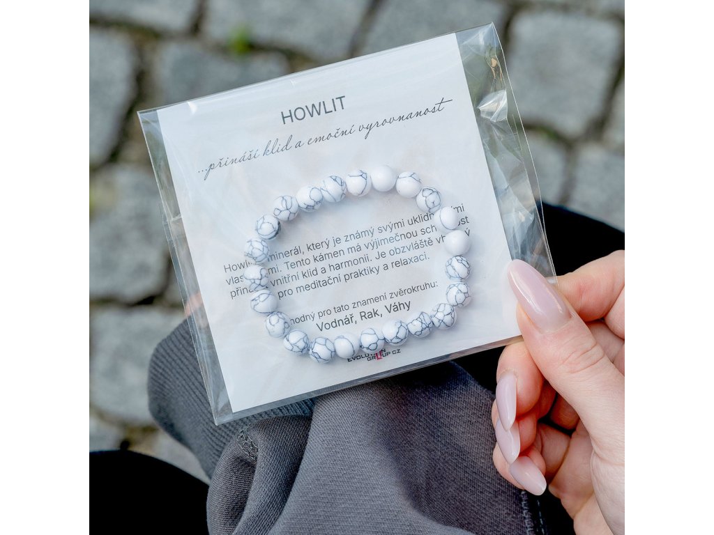 Howlit je známy ako kameň pokoja , trpezlivosti a vnútornej rovnováhy. Pomáha tíšiť rozbúrené emócie, podporuje sústredenie a napomáha pokojnému spánku. Je ideálnym pomocníkom pri strese, nespavosti alebo v obdobiach, kedy treba nájsť vnútorný hlas a upokojenie. Jeho jemná, ale silná energia harmonizuje telo aj myseľ.