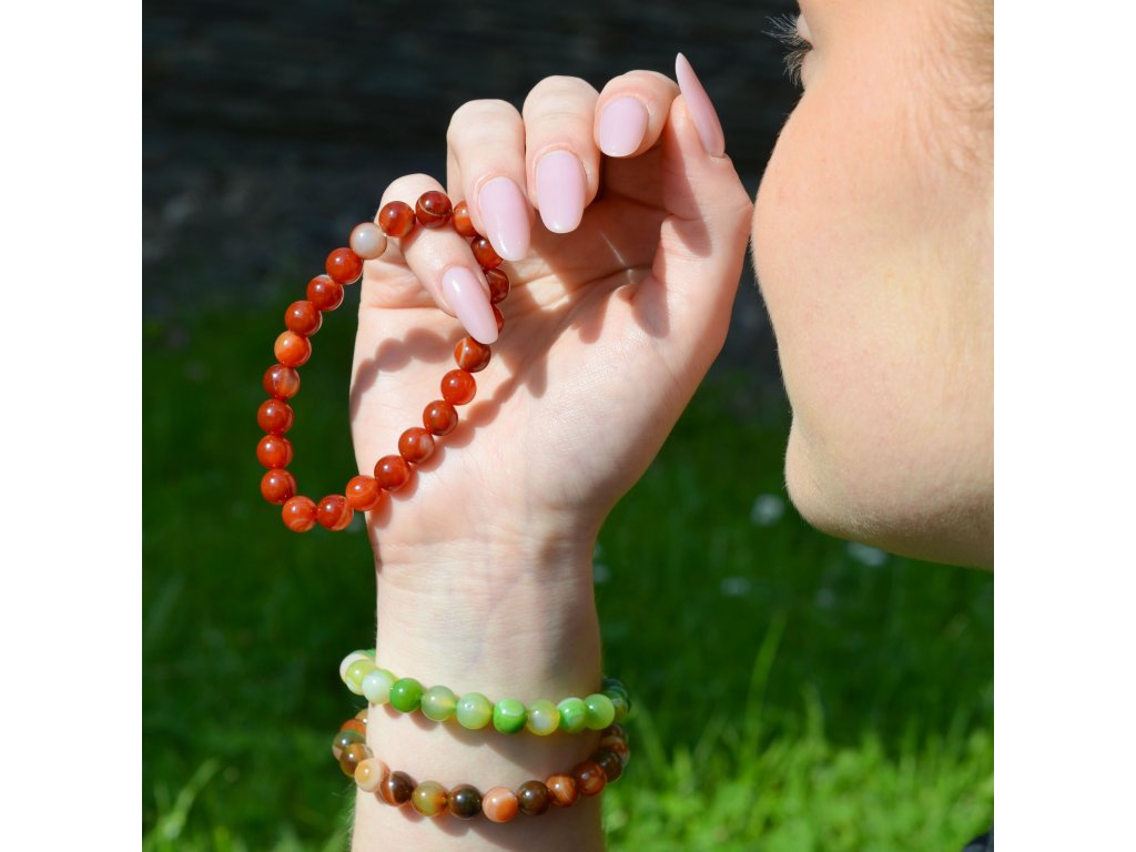 Tento elegantný náramok z prírodného koralu zaujme svojimi sýtymi, teplými odtieňmi – od tlmenej tehlovej a oranžovej až po hlbokú tmavo červenú. Hladké korálky s priemerom 8 mm pôsobia naživo a harmonicky, pričom každý kus je vďaka jemným farebným prechodom a kresbe originálom.