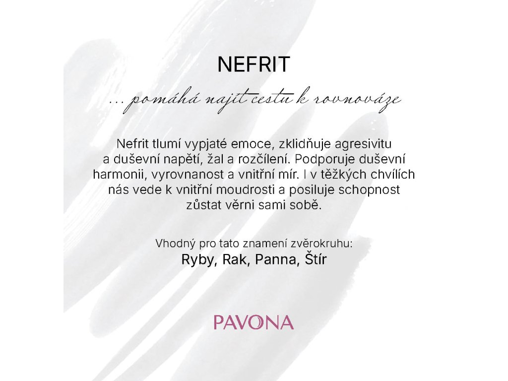 Ozdobte svoje zápästie do jemnej harmónie s týmto nádherným náramkom z pravého nefritu. Namiesto klasických korálikov je zložený z oválnych kameňov s jemne brúsenými plochami, ktoré zaisťujú krásnu hru svetla. Každá korálka je originál s jemnými prírodnými kresbami, vďaka ktorým náramok pôsobí unikátne a elegantne. Nefrit tlmí vypäté emócie, upokojuje agresivitu a duševné napätie, žiaľ a rozčúlenie. Podporuje duševnú harmóniu, vyrovnanosť a vnútorný mier. Aj v ťažkých chvíľach nás vedie k vnútornej múdrosti a posilňuje schopnosť zostať verní sami sebe. Elastické prevedenie zaisťuje ľahké nosenie a pohodlné prispôsobenie zápästia.