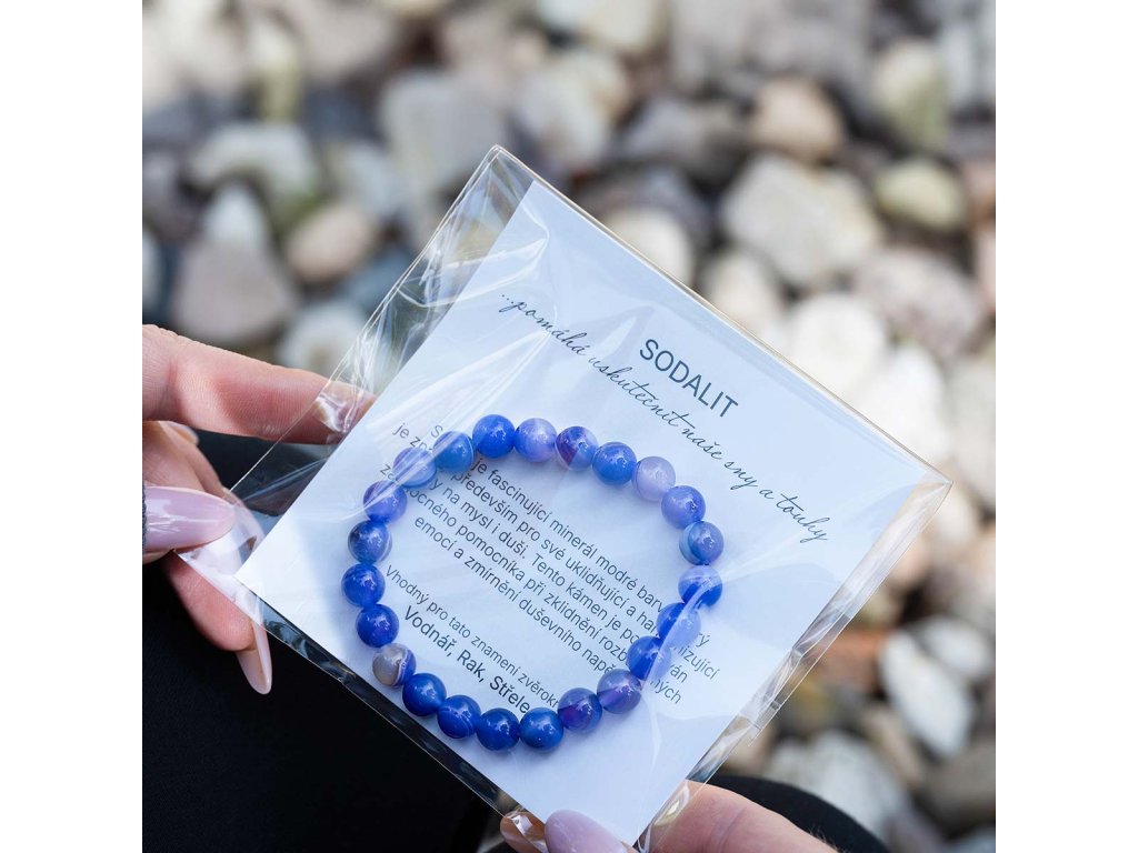 Náramok je navlečený na kartičke s popisom vlastností sodalitu a uložený v ochrannom sáčku.