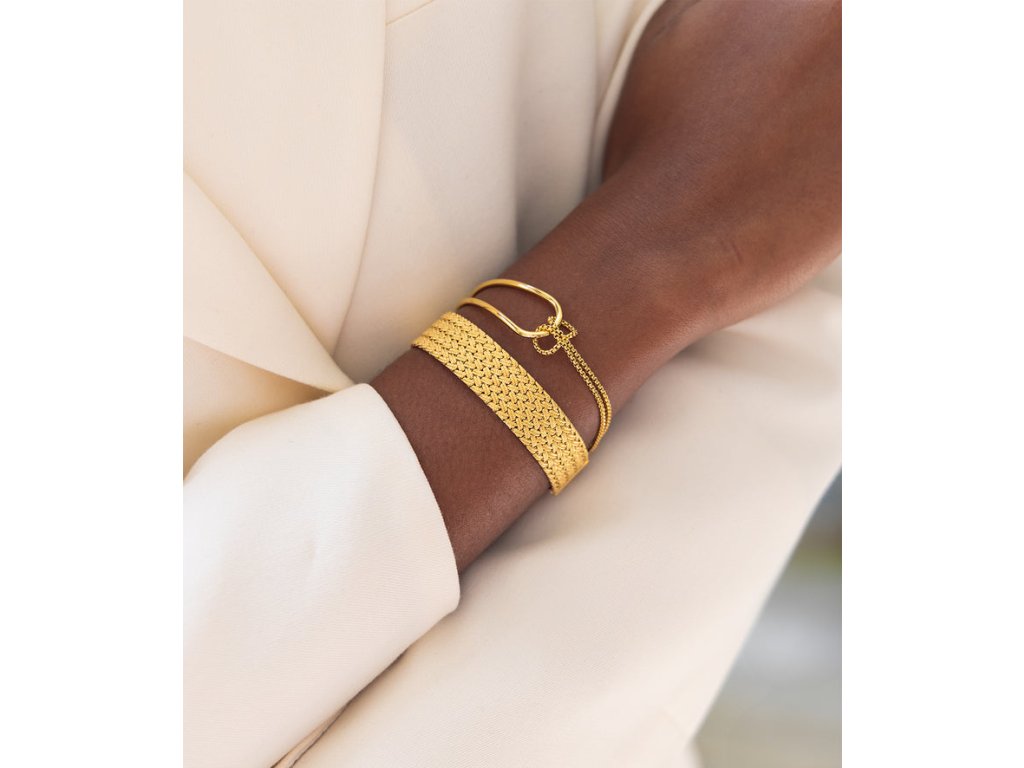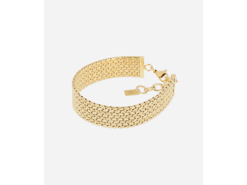 Veľký náramok z pozlátenej ocele. Vyrobený z prepletených očiek, je z jednej strany matný a z druhej lesklý.