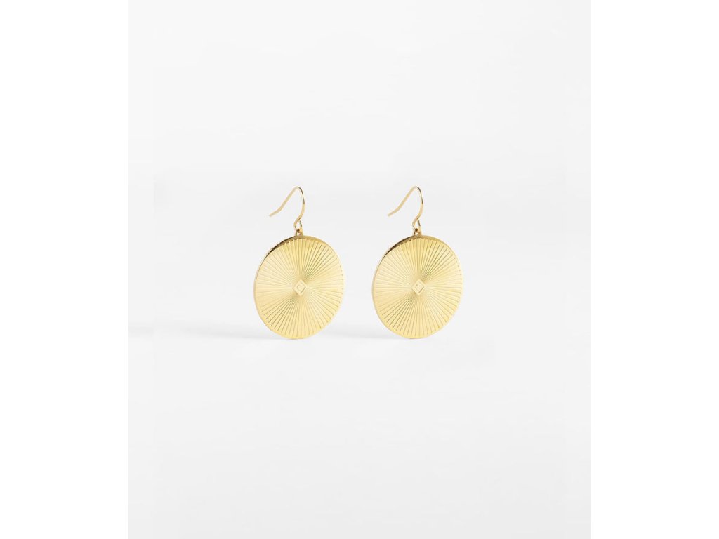 Náušnice z hladkej ocele pozlátené jemným zlatom s kovovou guľôčkou vygravírovanou sústrednými líniami, ktoré vytvárajú efekt slnečných lúčov.