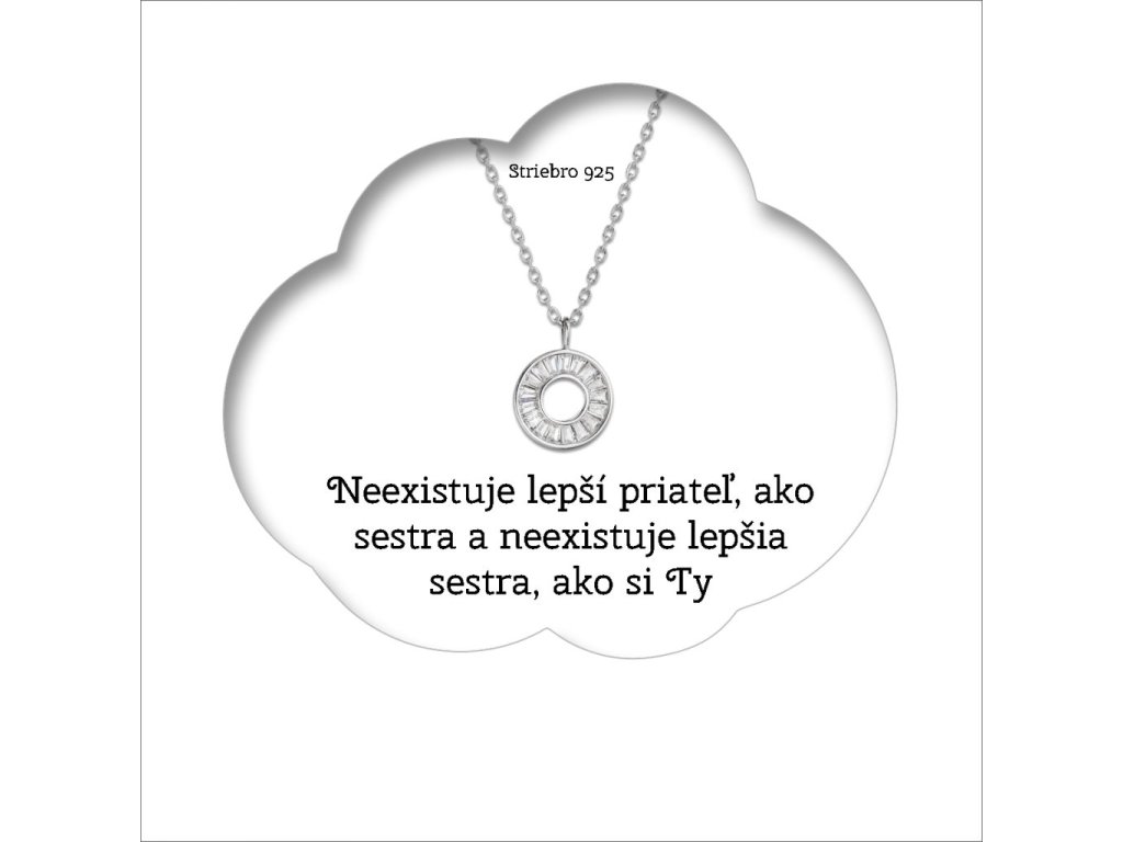 Darčekový set obsahuje strieborný náhrdelník s prekrásne trblietavým okrúhlym príveskom , ktorý je zavesený na darčekovej karte s nádherným prianím „Neexistuje lepší priateľ, ako sestra a neexistuje lepšia sestra, ako si Ty“. Krásny nežný darček pre vašu sestru. Mať sestru je ako mať priateľa, obrancu, poslucháčov a sprisahancov v jednom.