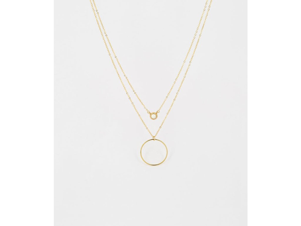 Dvojradový náhrdelník z ocele pozlátený jemným zlatom, na ktorom sú zavesené prívesky.