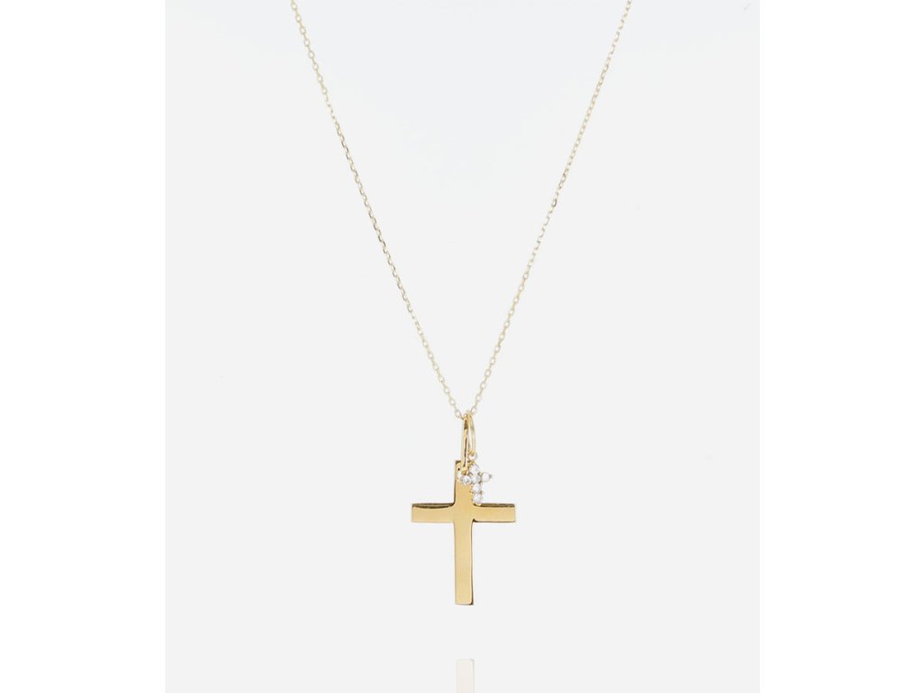 Oceľový náhrdelník s jednoduchým pozláteným povrchom, osadený oceľovým krížom a menším krížom osadeným zirkónmi.