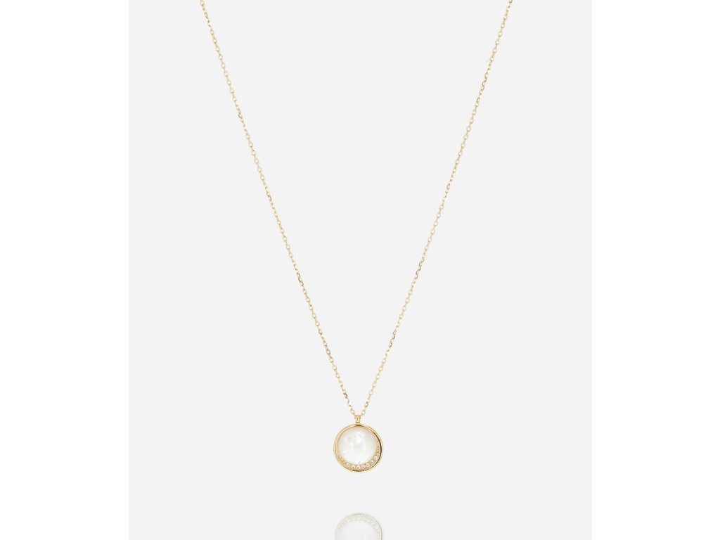 Náhrdelník z hladkej nehrdzavejúcej ocele pozlátený ionizáciou s okrúhlym príveskom osadeným perleťou a zirkónmi.