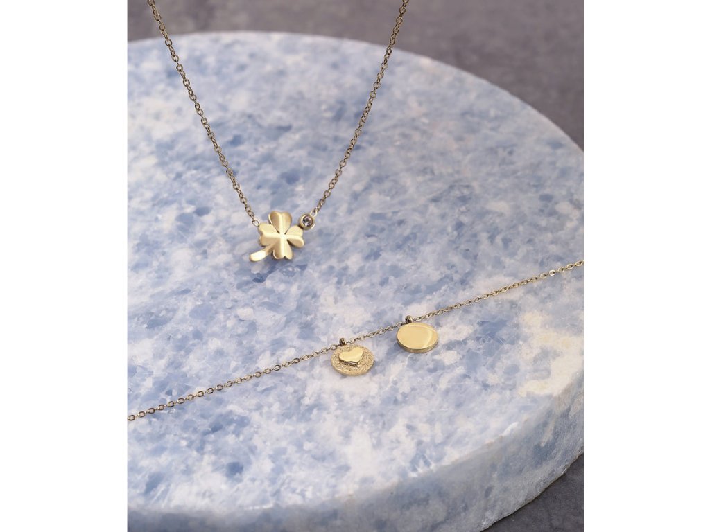 Retiazkový náhrdelník z hladkej ocele pozlátený jemným zlatom zdobený motívom štvorlístka doplneným bielym zirkónom.