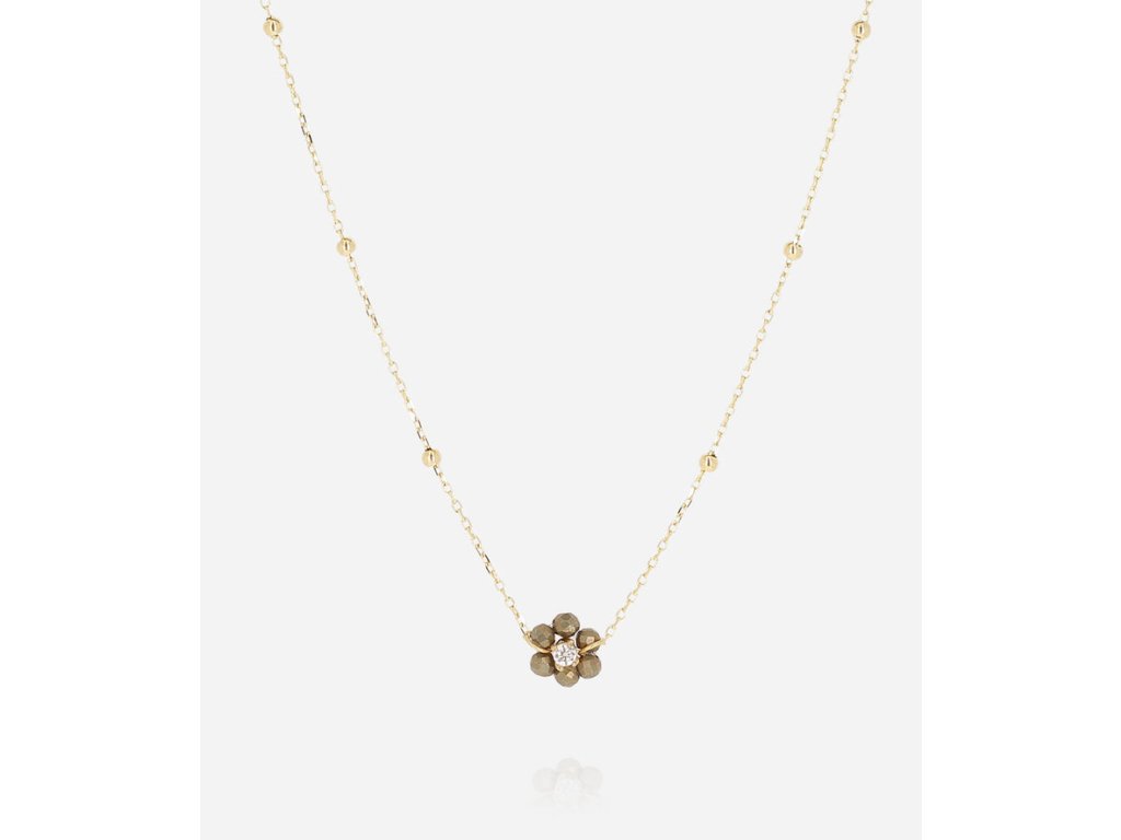 Retiazkový náhrdelník z ocele pozlátený, na ktorom sú osadené korálky v tvare kvetu so zirkónom v strede.