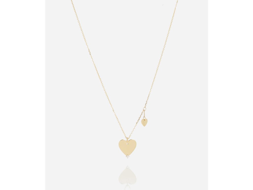 Náhrdelník z hladkej ocele pozlátený jemným zlatom, osadený dvoma príveskami v tvare srdca rôznych veľkostí a zirkónom.