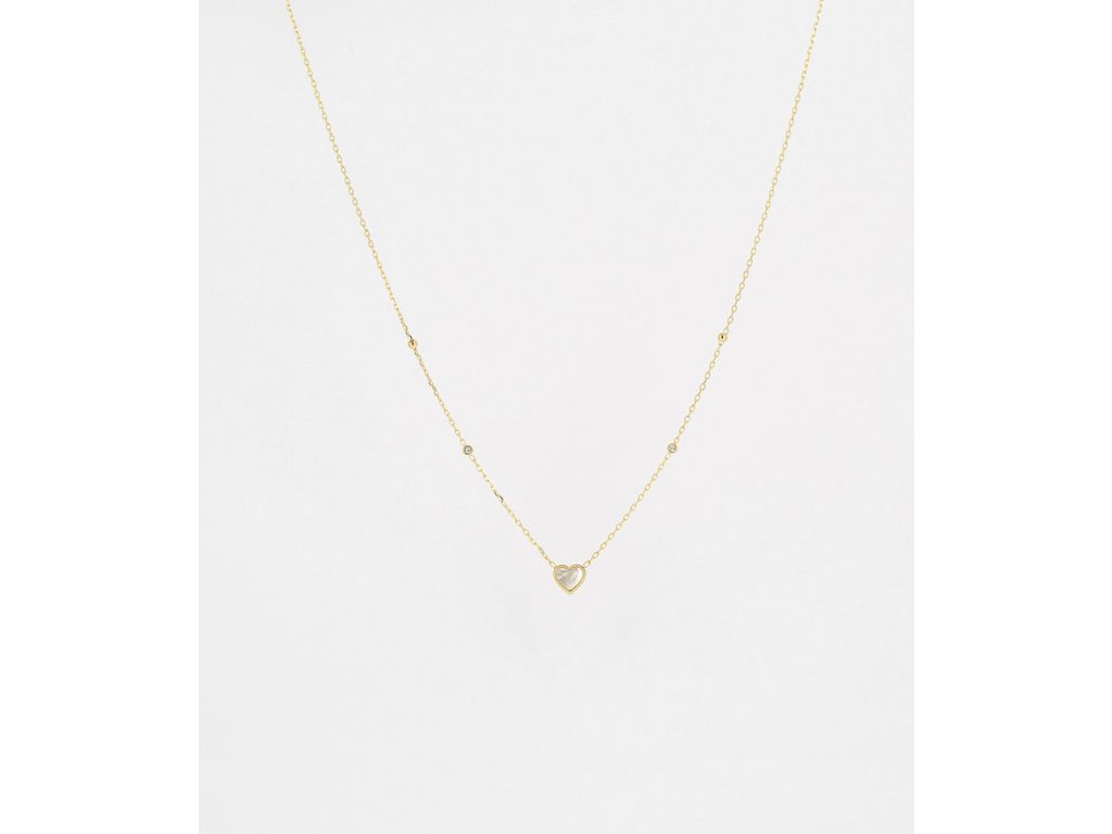 Náhrdelník vyrobený z hladkej pozlátenej ocele s malým farebným príveskom v tvare srdca. Na retiazke sa nachádzajú aj dva malé zirkóny a oceľová guľôčka.