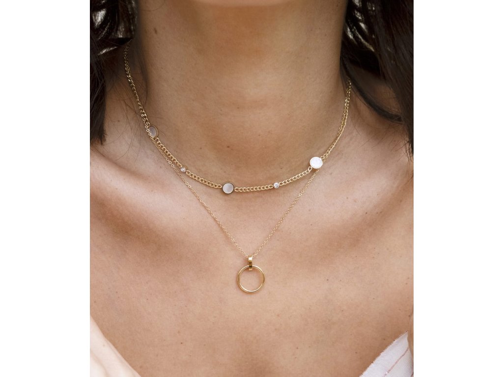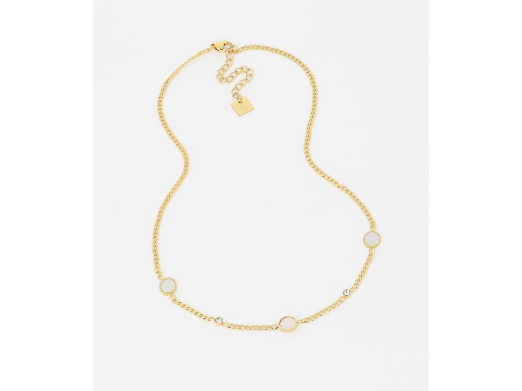 Náhrdelník z ocele pozlátený jemným zlatom, na ktorom sú pripevnené oceľové platničky osadené perleťou a zirkónmi.