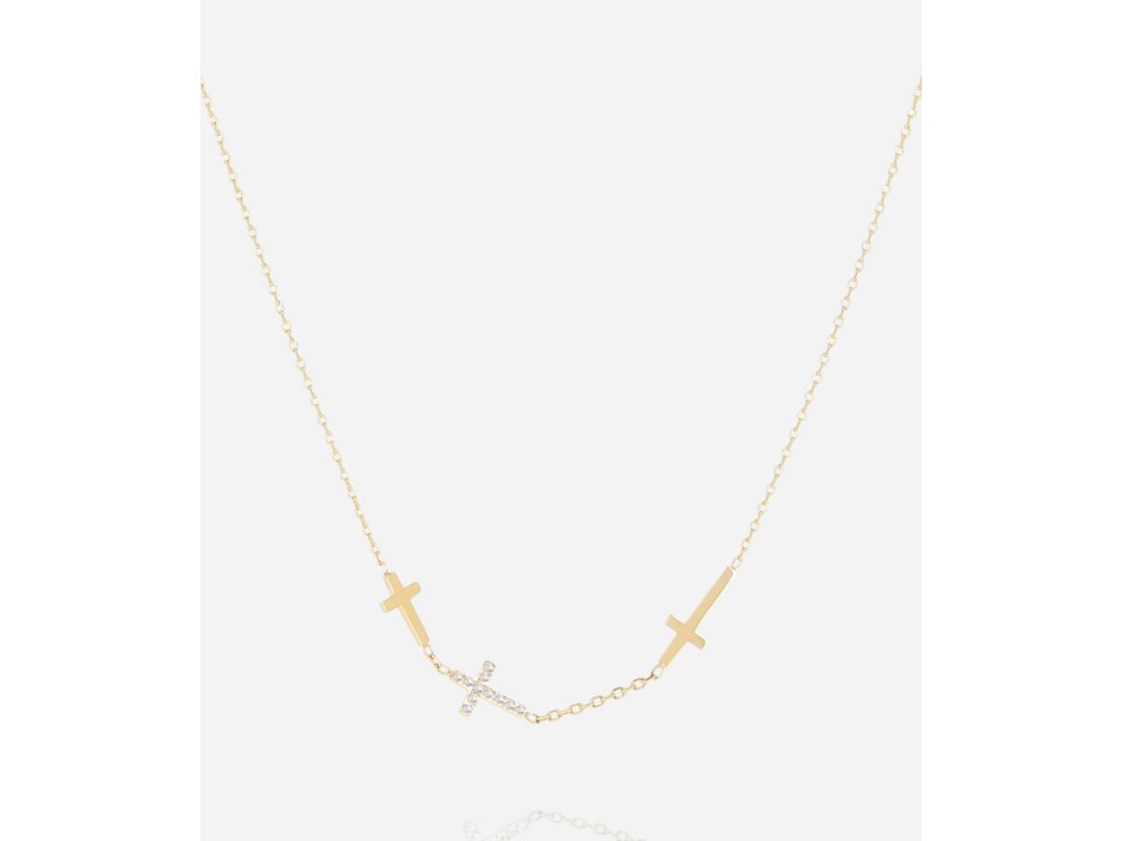 Náhrdelník z hladkej ocele, pozlátený jemným zlatom, na ktorom visí krížik osadený zirkónmi.